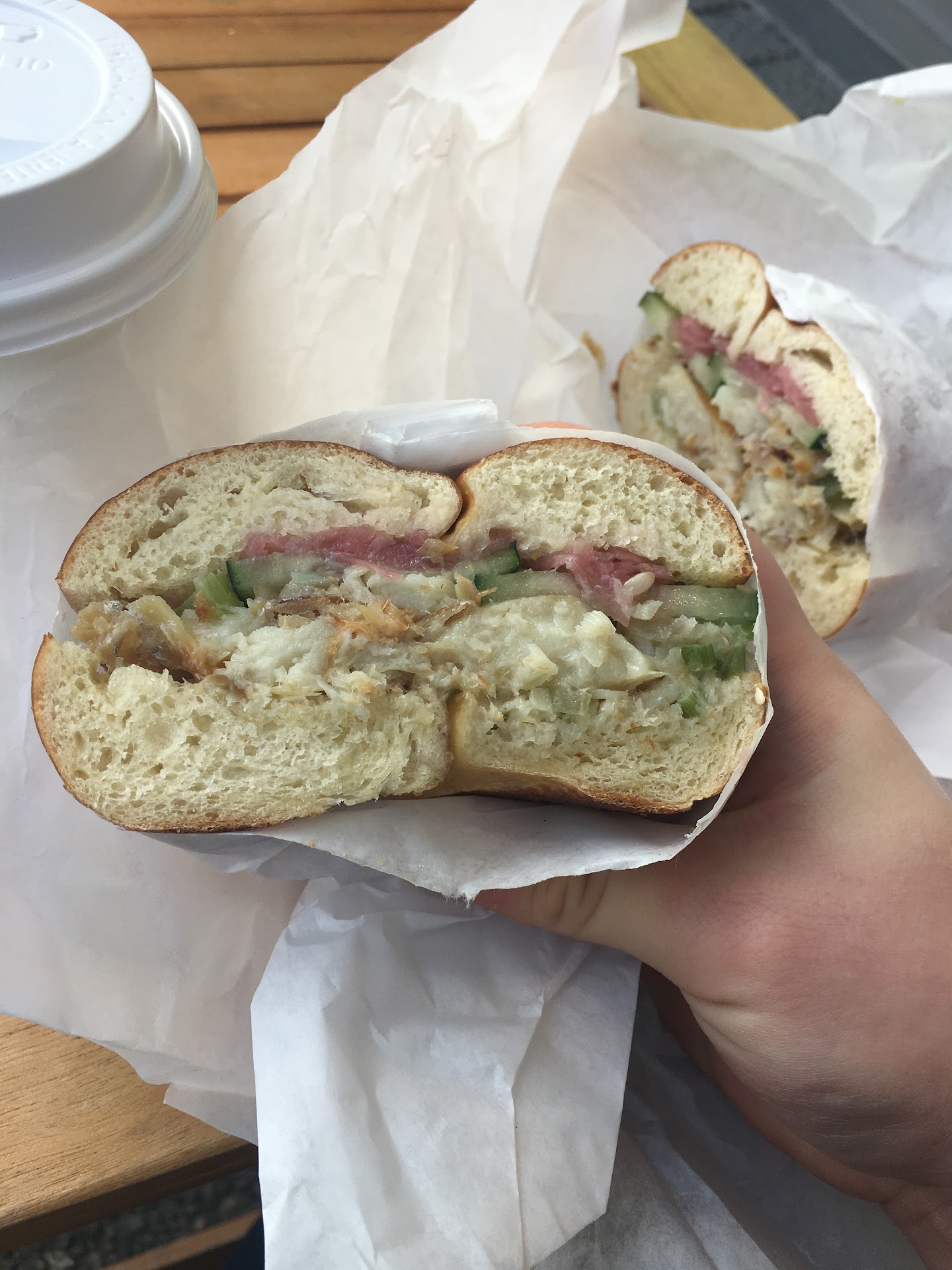 I had the whitefish sandwich and hot cocoa, and both were so bland I thought my tastebuds had gone wrong. Ingredients were fresh, but the fish was under salted, pickles were near flavorless, and the bagel was just bread. Better texture than whitebread bagels, but it did not taste like a bagel. Cocoa was definitely some kind of basic powder with frothed milk.