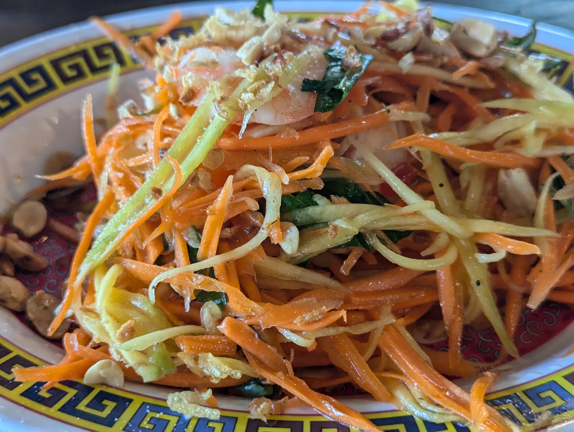 The salad had more carrot than mango, but they were both finely shredded and well seasoned. With some crushed peanuts and fried shallots and bits of fresh herbs.
