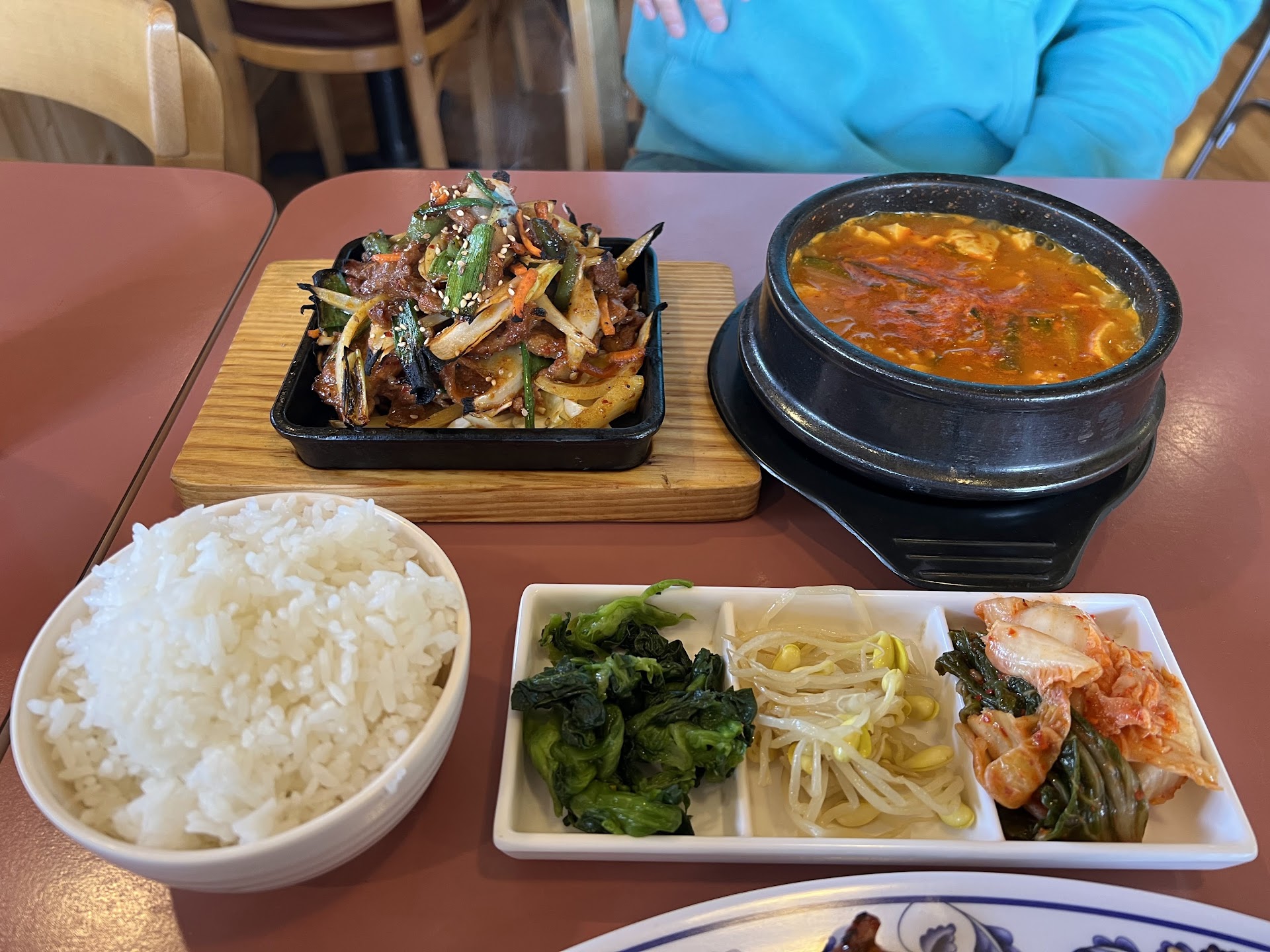 As I tasted the side dishes, they had a comforting, homemade quality, like a warm meal prepared at home. The flavors were neither too salty nor too bland, with a clean taste that didn’t rely on artificial seasonings. The dishes—spicy pork bulgogi, seafood soft tofu stew, stone pot bibimbap, and Mongolian beef—reminded me of my mom's cooking, which I loved. While the food didn’t have the commercialized taste of popular chain restaurants, it felt like it was made with care and attention, just like a meal prepared at home.