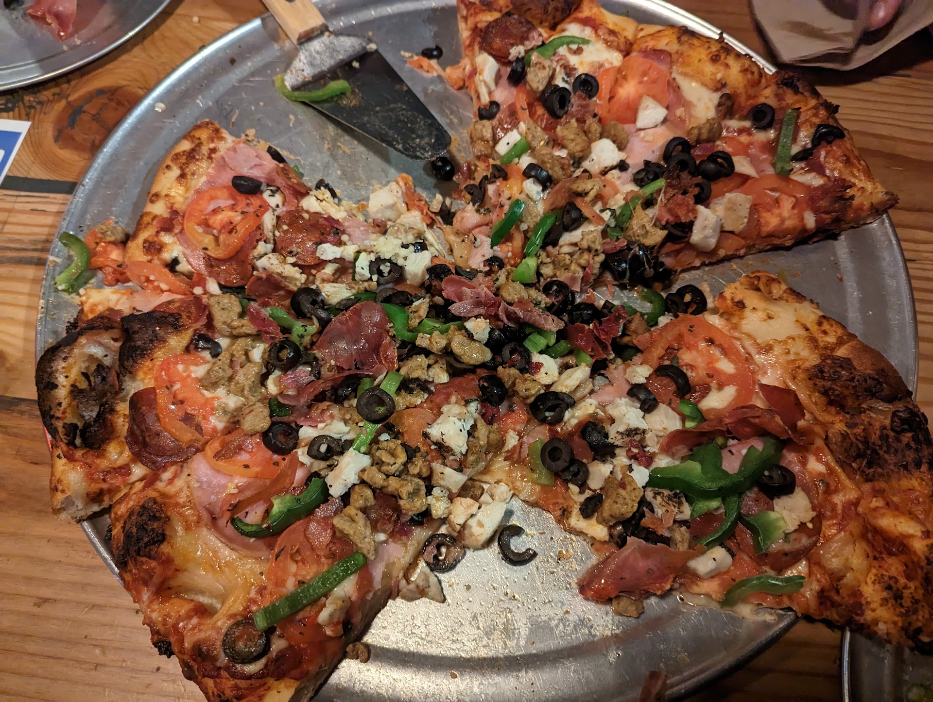 Read moreYou can tell the manager wasn't there (or they need to be completely retrained, as two of our party members are managers and were enraged at our dismal service). It took 40min for a salad and 2 hours for a pizza despite only having 3 tickets in the kitchen (we could see the que from my table). For $40 dine-in pizza I expect table service but no. Twice we had to walk up to the hostess for a glass of water. Not to mention our pizza was literally falling apart, it was floppy and had no structure to it and they didn't even bother to cut it into slices, we had to saw at it with the pizza slice scooper. Not to mention that we requested several items (such as olives) be removed from the pizza. As you can see, it's a saving grace that it was due to preference, not allergies. Meanwhile, at 8 pm while we're still eating the staff started turning off lights on us and cut off the music -- mind you, they don't close until 9 and they were still getting trickles of orders. The icing on the cake, though, was when they let a mom and her children use the restaurant as a jungle gym, running back and forth all around the restaurant!! I'm already not a big kid person, even less so when it's not someone I like or even know and I'm trying to dine out with friends. Ignoring our obvious displeasure, the children rampaged and we were forced to listen to their squeals as they clambered past our table loudly and repeatedly. This was a terrible experience and I hope they improve because there's nowhere left to go but up. I would rather go to MOD (for better pizza at a lower cost) and sit at the park on a Friday afternoon. At least that way I'd get proper lighting and can walk out. This was like Chuck E Cheese without the games and the thrill of being a naive...