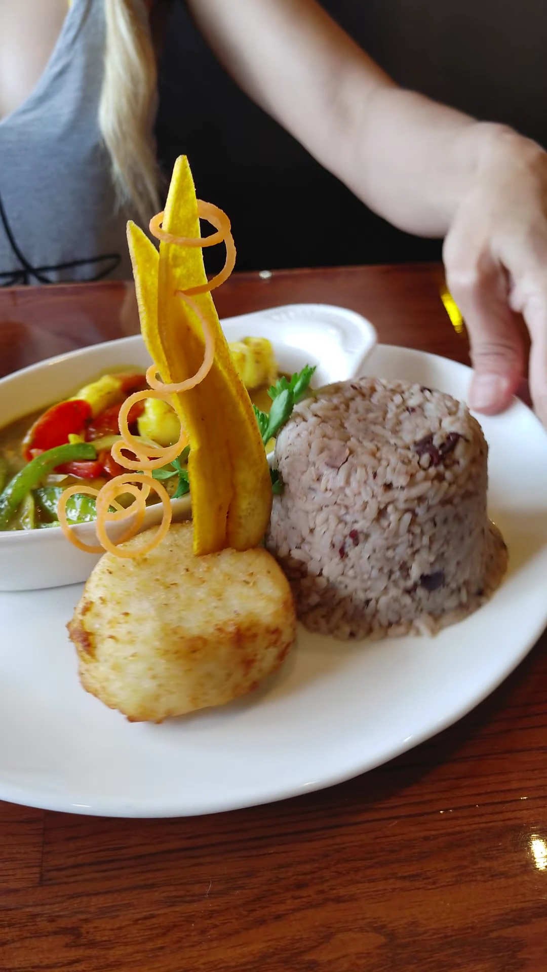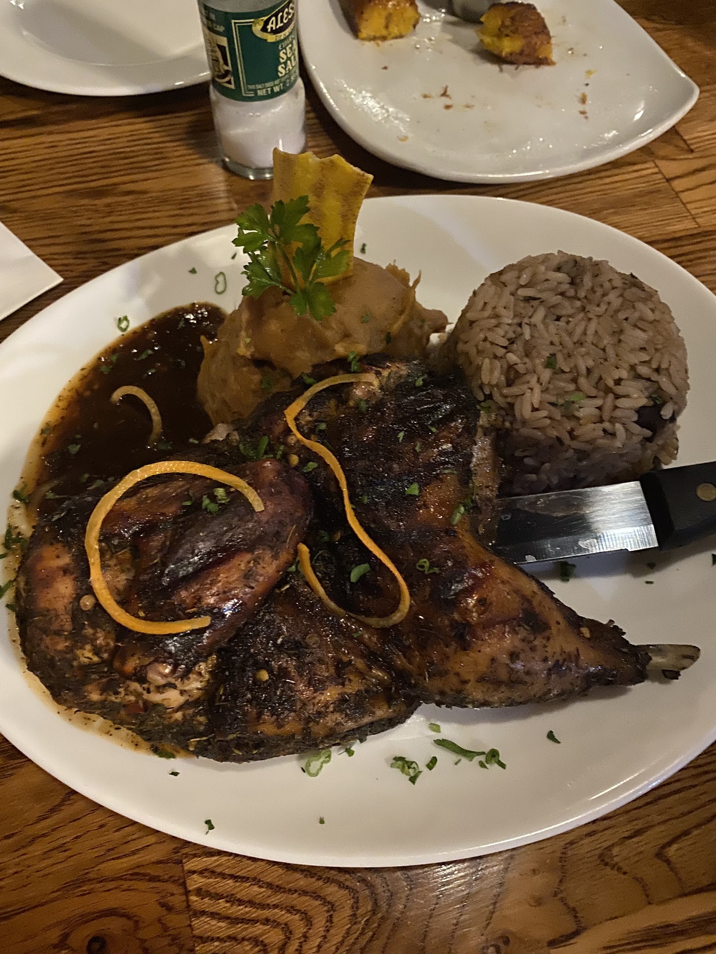 Most restaurants, and in my experience Caribbean restaurants tend to lean more heavily on loading your plate with carbs, especially inexpensive rice while skimping on the protein. The vegetables served are usually smaller and just for optics rather than actual nutrition.