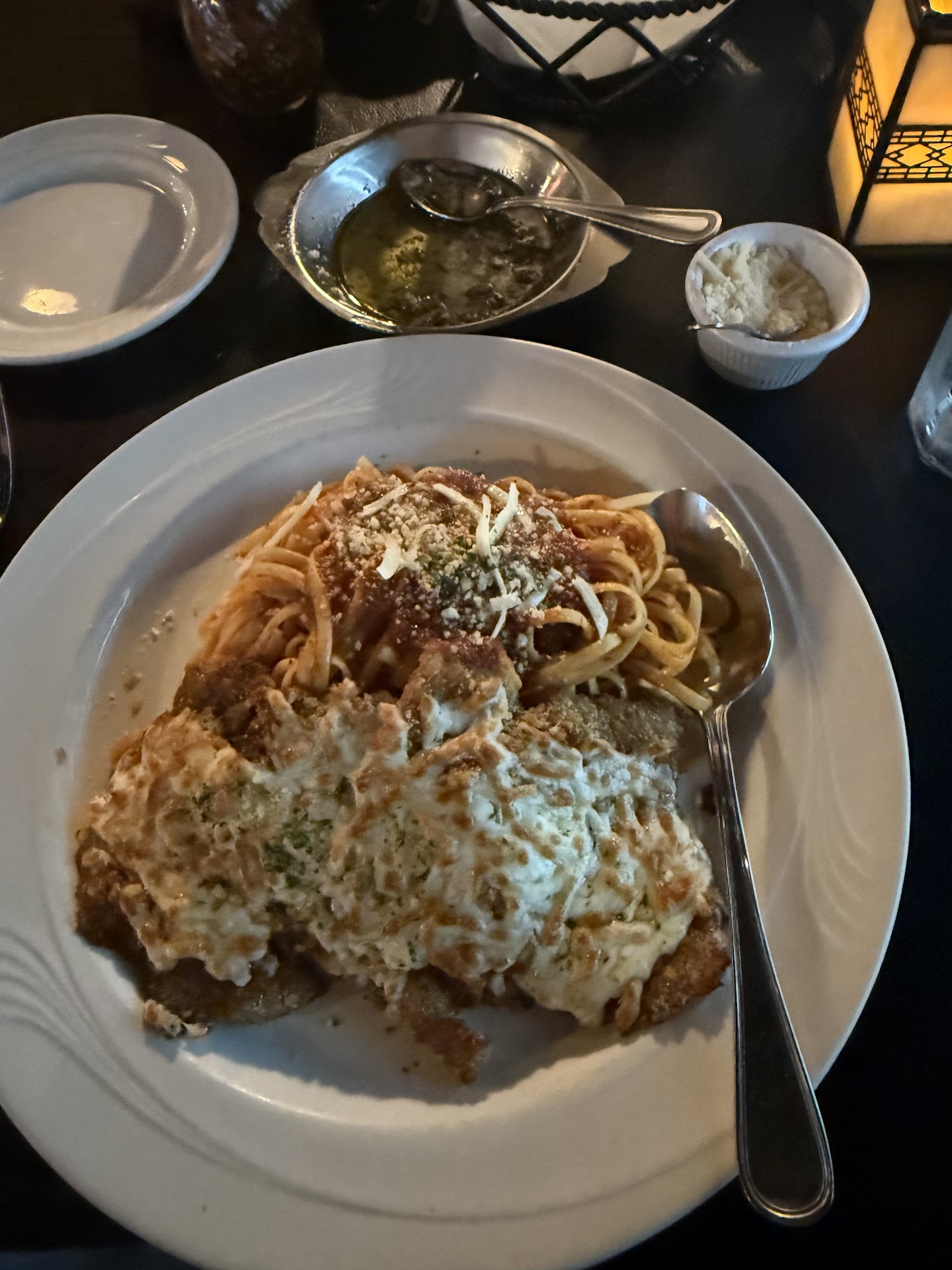 The eggplant parm is layered with cheese and was tender - and also delicious. It came with a side of angel hair pasta which was perfect.