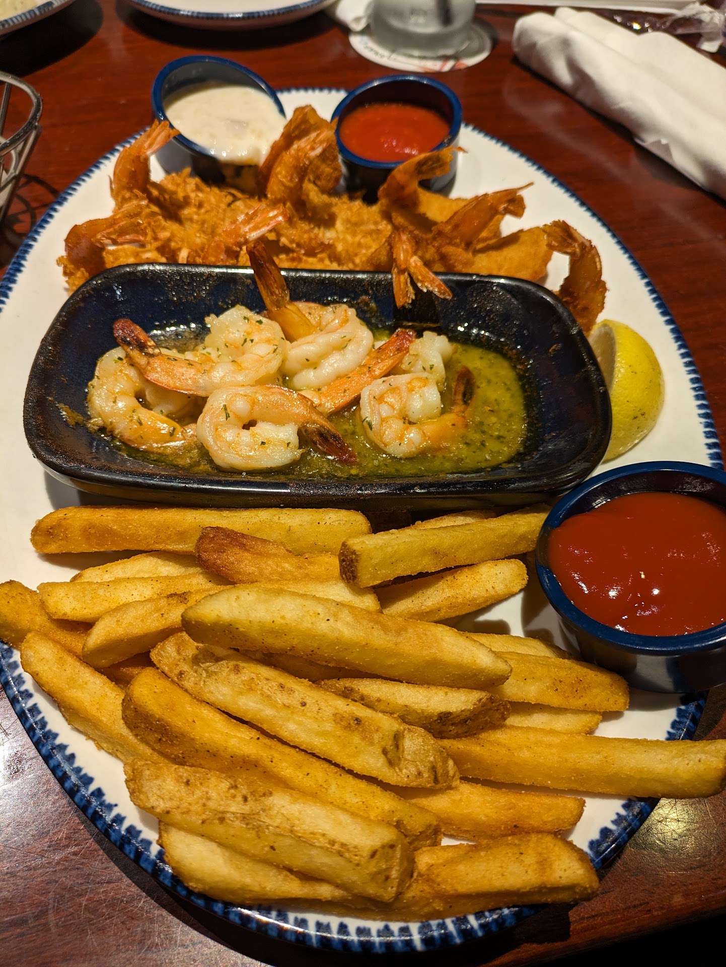 We each ordered the endless shrimp. I started with the garlic shrimp scampi, coconut shrimp, and Walt's favorite with a side of fries. Then I got the shrimp linguini Alfredo and the grilled shrimp skewer.