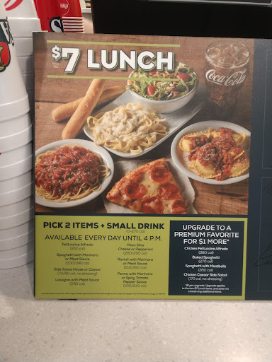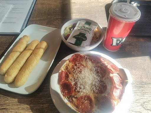 Let me say it right off the bat - the food is not to die for, but it is alright. If you're in the mood for pasta and you want it fast then this is the place. They've got really good deals if you need dinner in a crunch - pizza, spaghetti, alfredo you name it. If you dine in you'll get endless breadsticks as well. If you order take out they will give you so many breadsticks you don't know what to do! We have dined in when family has come to visit, and we've taken out when we didn't feel like cooking that night.