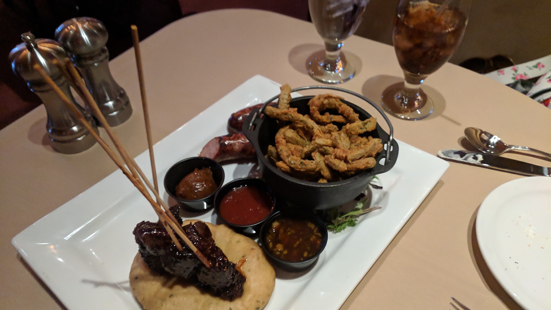 Our sampler came soon. We both enjoyed the Cactus Fries, hot and crispy. We both loved the Rattlesnake Sausage, tender and juicy with a little bite. My wife enjoyed the Bison Brochettes but I found mine to be very tough and hard to chew.