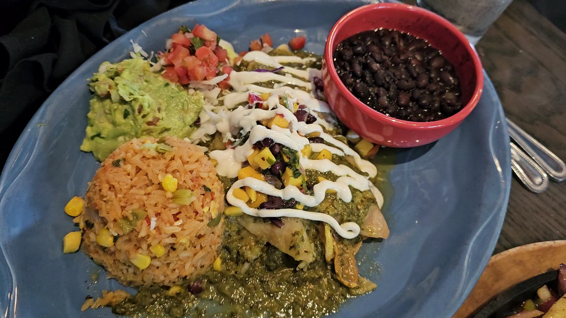 Fire Roasted Vegetable Enchiladas Green Tomatillo Sauce, Cashew Cheese, Black Bean Mango & Avocado Salsa. Served with Black Beans, Rice, Pico de Gallo