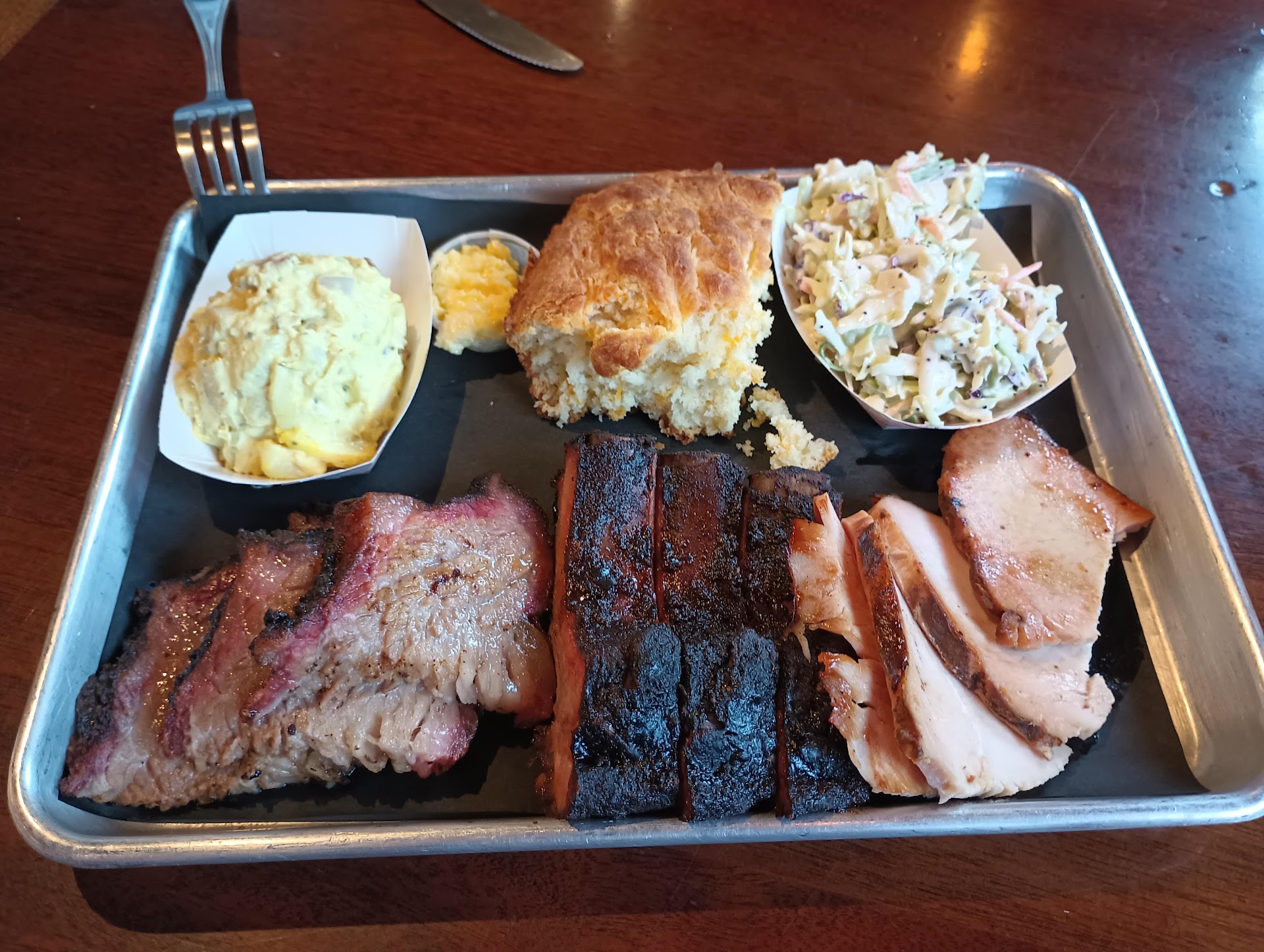 Weāve learned from previous BBQ meals itās best for us to share a two or three meat meal to enjoy as much as comfortably possible. So today it was the 3-meat platter with two sides and a cheddar biscuit. Meats were brisket, ribs, and smoked turkey. Sides of potato salad and coleslaw. Somewhat surprisingly for this area I was asked if I wanted fatty or lean. Very common in Texas, most joints near me donāt bother to ask. You get what you get. Fatty all the way for us. Soon we received a platter of sensational looking Q. Fantastic smoke ring on the brisket and ribs. Moist, somewhat thin, slices of turkey. A fluffy corner biscuit and clearly house made slaw and pot salad. Brisket was sliced thicker than expected and well barked with their distinct rub, heavy today on the black pepper. I put pepper on everything almost and this was just at the point of almost too much. The meat was moist and flavorful even without any of the four choices for sauce-original (a little sweet), sweet (molasses notes), hot (canāt do it), and a fourth I neglected to note. The original, in our opinion, went best with all the meats. Especially the wonderful turkey. One of the best in recent memory. I know this will be my sandwich of choice on my next visit. The only small meat misstep in my opinion on our visit was the just too much black pepper burn on the ribs. When I bit below the bark the meat was so flavorful but I feel like someone got carried away with the rub here. Edible but a bit disappointing. Hoping for lighter hand next visit.