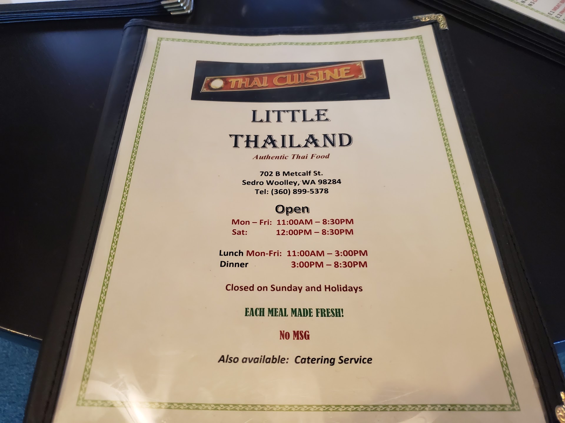 Ā Ā Ā Read moreMy wife and I went in to Little Thailand for an early supper, around 4:30 pm, and we were quite pleased with both the food and the service. They just opened at the end of August so word hasn't had time to spread yet about this little gem in the heart of Sedro.