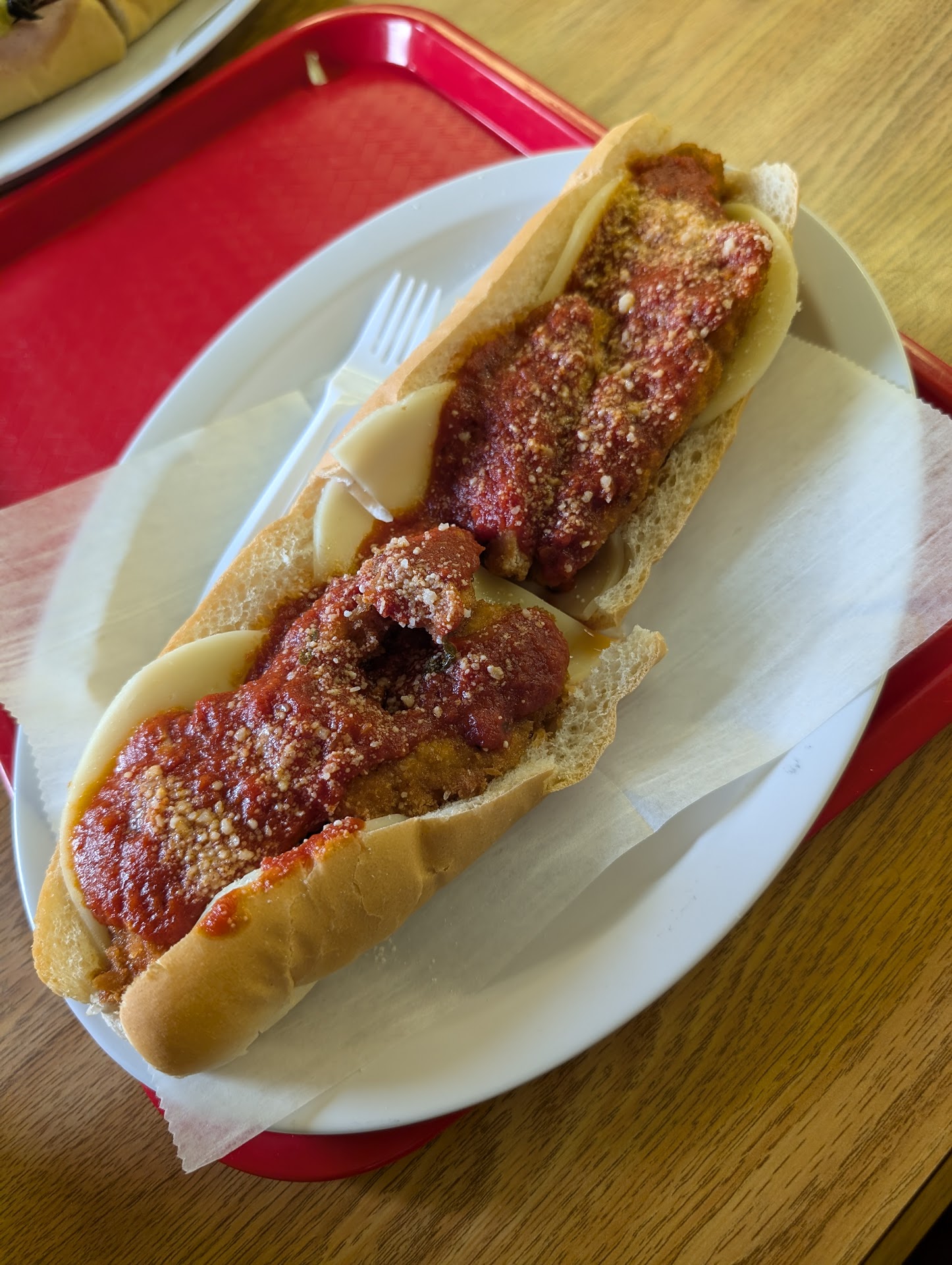 I went with the chicken parm sandwich. I expected a fried, formerly frozen patty and mediocre sauce Inna roll. What I got (for a very reasonable price) was real chicken breast, clearly hand breaded and fried, with a chunky, fresh, tasty sauce that ended up being a bit watery when put up against the cold provolone in the roll and made everything a bit uncomfortably soggy and messy. This may have been alleviated by baking the sandwich a bit before serving.