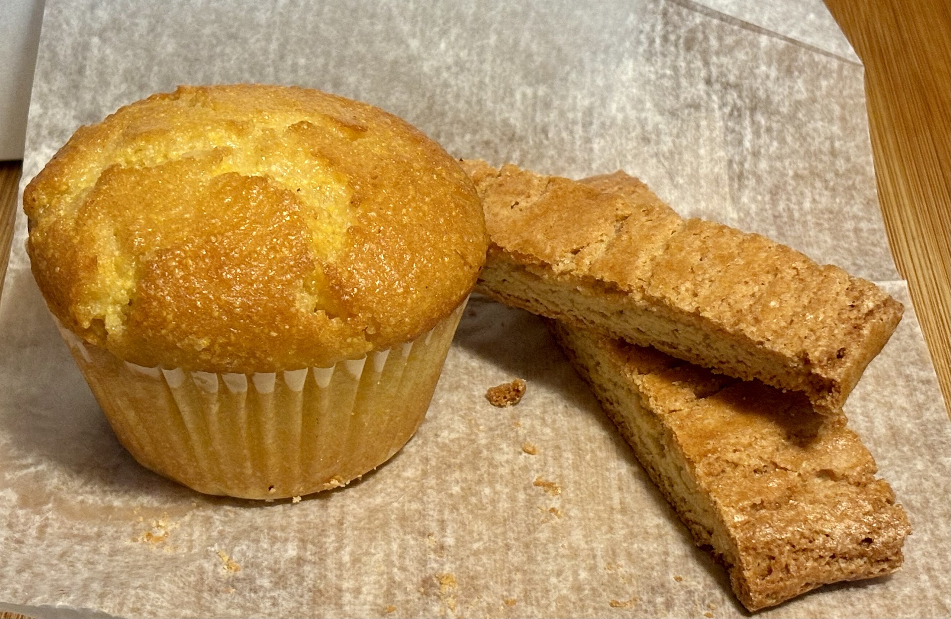 The regular biscotti was the standout bite pairing well with my morning hot tea. The almond biscotti was okay. I didnāt pick up much almond flavor although there were several slices of almonds. The corn muffin was cooked nicely and average in taste.