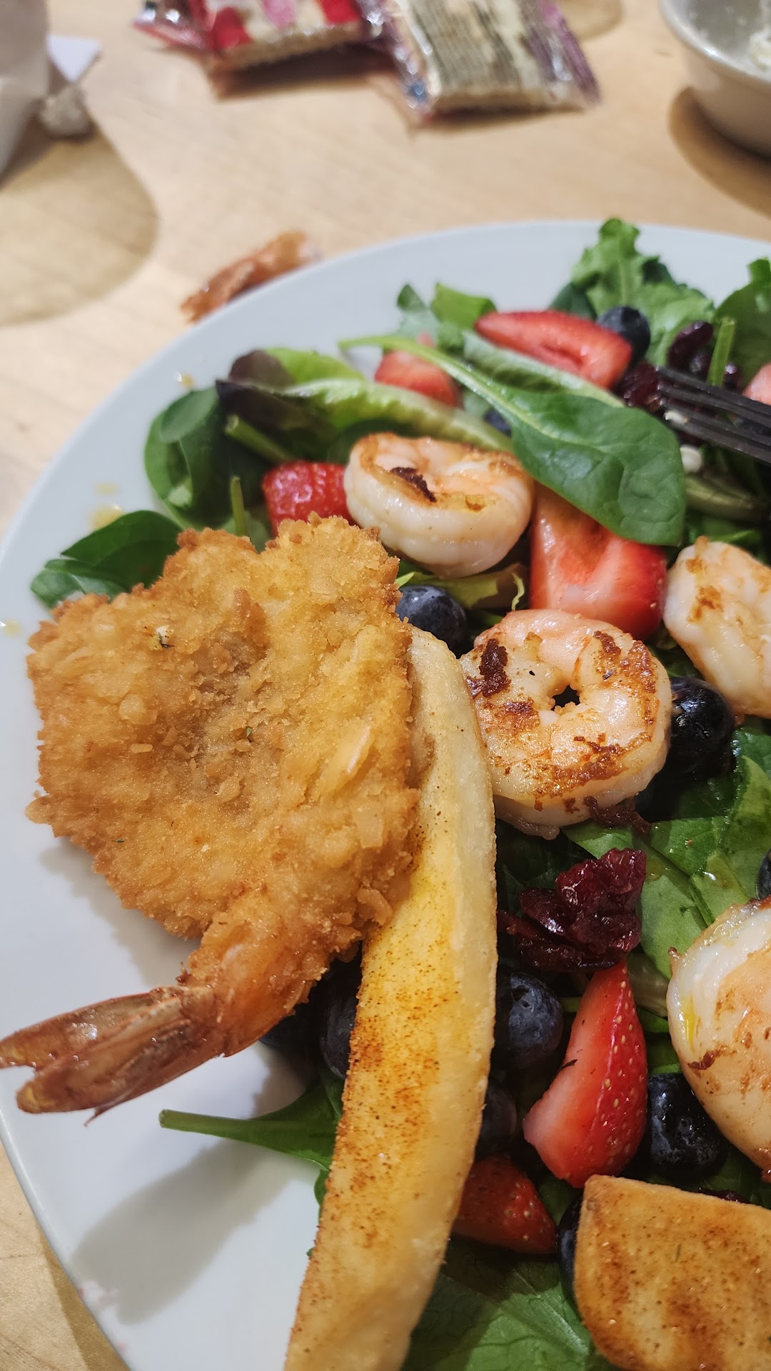 Love the fact that 1838 now open on Saturdays until 8pm!! In Seguin, it's hard to find any restaurant other than fast food open. 1838 serves a variety of dishes which can include Enchiladas to a good ole Fried Fish plate. On this date, took my elderly parents. My go to dish is usually this Strawberry Salad which can choose to add Chicken or Shrimp or vegetarian style. I chose shrimp this time around. Their shrimp is grilled and it is soo good. I choose to remove blue cheese and raspberry vinegrette. Their Ranch is soooooo delicious!! I can literally eat it as an appetizer with crackers! I caught my father doing the same!! You do have to ask for additional crackers but the waitresses there are ALWAYS so nice and helpful. This visit we had a very nice waitress who was spanish speaking and brought our drinks and the other waitress took our order. We did not wait long at all to have us seated. This was around 4pm on a Saturday. My husband had Fish and Shrimp. I could not believe the size of the Fried shrimp! Pictured below. It was soo good!!! My mother ordered the pork loin which was breaded and stated that the meat was very tender. Huge portion size as well. Now there was a price difference in Fish and Shrimp, the one sign had $16.99 as the special as you walked in but the sign by the desserts said it was $15.99. We didn't have dessert as they had run out of their coconut pie which is soooo delicious. On a previous To Go Visit.. picked up a slice and it was very good and per ladies, they make their own desserts there. Fyi. Pricing...little pricey. For the 4 of us close to 75-80.00. With my parents budget may not be able to come that often but the food is worth it....