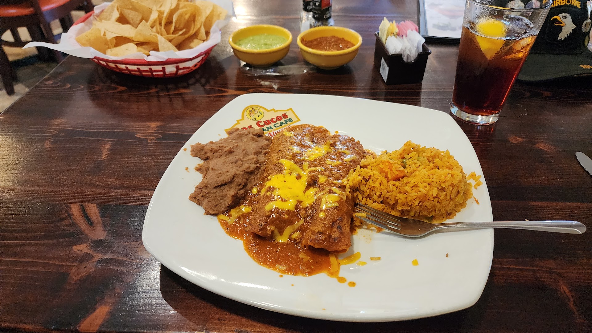 Never did I EVER think I’d be eating at a Mexican food restaurant on the frontage rd of a major hwy in Seguin, much LESS having an experience SO thoroughly satisfying and divine that I just HAD to write a review once back in the vehicle!! We arrived around 4, before the rush hour traffic kicked in but the parking lot was already 7/8ths full but there was no waitlist or line. The restaurant was just finishing shift change and the surroundings were clean and neat. Our table was clean, as were the chair seats. The young lady dropped off the ubiquitous tortilla chips and red salsa and green salsa. The chips were thin, hot and tasty, the green dipping sauce well balanced between a little north of mild and a little spicy…we never got around to the red salsa 😆 the first one was so good! Then, what turned out to be the best waiter I’ve been served by in over 18 yrs (and I used to own a restaurant!) HUGO arrived to take our drink order. We both ordered the sweet tea and it was p-e-r-f-e-c-t! Not too sweet like S Carolina sweet tea. I could tell Hugo had the innate timing that all great waitstaff have. He was definitely on his “A” game today. My friend ordered Enchiladas Guajillo and I had my forever favorite: Enchiladas Verdes. When the plates arrived, the presentation was excellent and inviting. What I did find different about my dish was that the chicken was cubed instead of shredded like the chicken in my friend’s dish but the charbroiled taste was superb. The tomatillo sauce was delicately balanced and flavorful and the enchiladas were topped off with a dollop of sour cream, as is the norm. My friend had never had the heavier, richer Guajillo sauce but said he really loved the mild chili sauce’s elements (he used to have a restaurant as well…a steakhouse, though). There wasn’t much, if any conversation going on, so wonderful was the food. The refried beans were a tad dry around the edges but I just poured a bit of the green chip salsa on them and voilà, perfection! The Mexican rice was quite flavorful and moist. More than adequate proportions of enchiladas was a welcome surprise and Hugo showed up to refill the tea glasses numerous times, so much so that my friend actually commented that Hugo never allowed the glass be found empty at any point! Like I said, attention to detail and subtle but precise timing…Hugo noticed everything going on at all his tables and this sense of timing allowed him to attend to all his guests needs at all his tables before they even noticed they needed anything! …Something that is VERY hard to teach waitstaff TO DO! It’s innate and instinctual. You either HAVE it or you DON’T. EXCELLENT customer service! He automatically prepared to-go cups of tea with separate cups of ice (!) and had the check ready unobtrusively (his body language knowledge serves him stupendously)! As we took our leave, I actually told Hugo that if I still had my restaurant I would have stolen him away from Cuco’s (in a SECOND!). BTW: Again, VERY decent price points considering the...