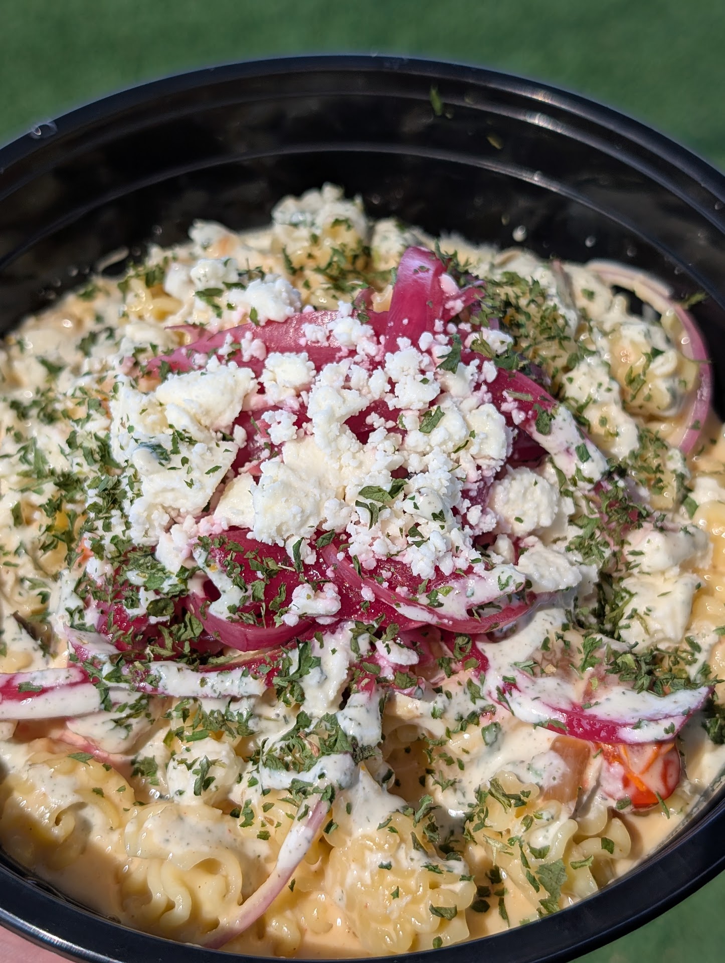I did the build your own, with both Yellow and white cheese, added some smoked sausage , roasted corn, topped with Hot Cheetos and chicharrones. OMG It was delicious, I wouldnāt change anything about it but I would ask next time for my noodles to be cooked just a tad bit longer.