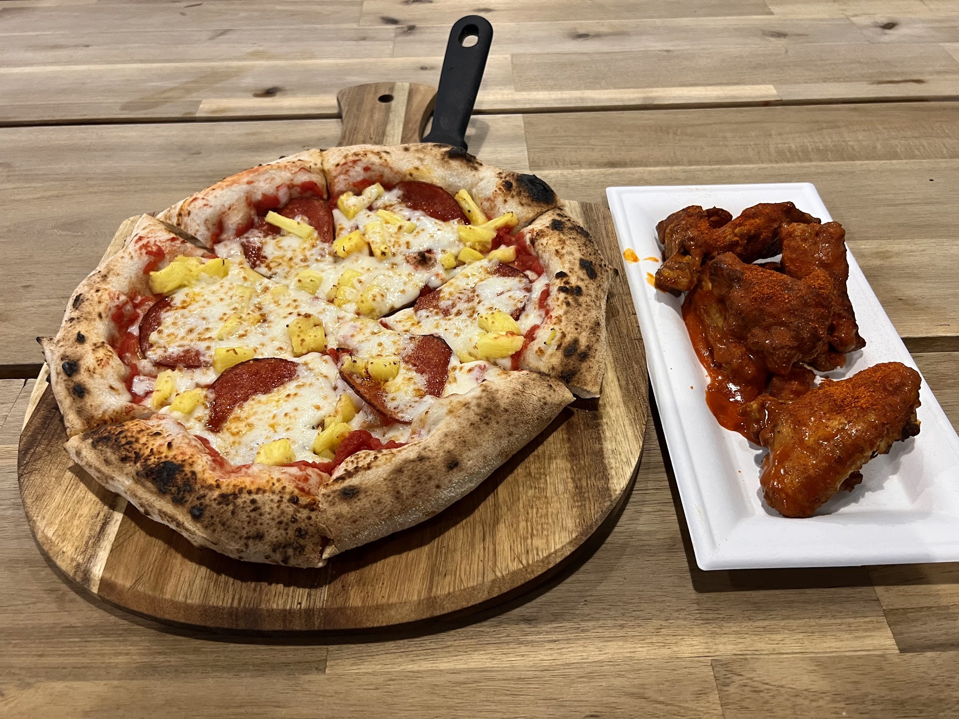 Ā Ā Ā Read moreDecided to finally check this place out. Upon entry, the renovations are obvious and the lack of AC was a little disappointing. Not sure if itās been like this since opening or something happened. Overall it was tolerable. Service was great throughout. The pizza had good flavor, itās a bit doughy and could use a little more crunch (my liking, which can be fixed by asking for crispier pizza Iām sure). The pineapple was fresh and not canned. (Either works for me) The wings were good but I got them warm, almost room temp. It was obvious they had been sitting there pre cooked. The flavor was good though. They were fall apart from over cooking which can be good or bad to some. Prices are fair for the pizza, the wings on the other hand, I donāt think 6 small wings should be $10.50. I will definitely come back once the restaurant...