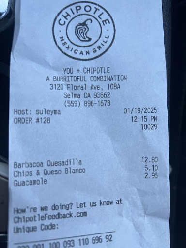 Read moreWent into store to order lunch for my husband and I and walked out with only his food. After I was shouted at by a male employee because the rules state I have to finish with the first order before I start the second. That would have been fine if the employee who had started my order asked me about my second bowl. Before I can say anything the employee very rudely said “ITS THE RULES you have to complete one order first” I consider myself a rule follower and if there had been THE RULES posted I would have followed them. I was so embarrassed by the way this gentleman spoke to me I just said forget it. The other employee looked concerned but didn’t offer me any recognition of some type of apology. There was a line building and all the employees looked stressed. You would think management would better prepare staff and store for the lunch rush. The manager was busy counting out receipts with 2 other employees. There was no steak, no chipotle vinaigrette, and the guacamole I paid top dollar was so sour and inedible. I am a Selma resident and I will not be returning. If your in the area The Habit is good and Deli Delicious is always fresh. Avoid...