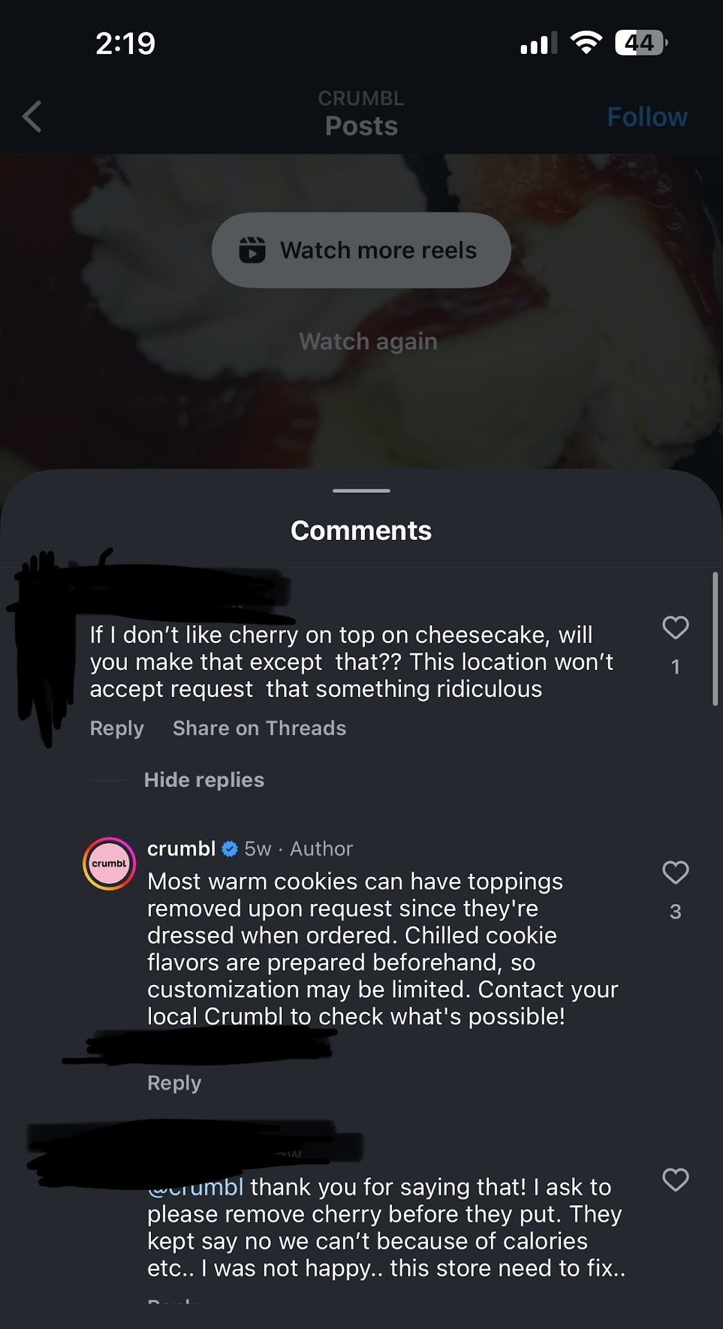 My most recent exp with Crumbl was an adventure to say the least but the manager (Erin) at the Forum location in Selma, TX made me a forever customer. Let me explain... I'm not a big cookie person but I love a good pastry and from Crumbl, I haven't had a bad one yet. As a big s'mores fan, I saw they had a s'mores cake in this week's menu and it was like a bat signal to me. I placed an order for delivery through their website for the s'mores cake, cheesecake, and some mini cookies. Upon delivery I noticed the icing of the Nilla cupcake mini cookie (a hit) and brownie peanut butter cookie (not my fave) was stuck to the roof of the box and that led me to investigate my Ring camera for the details of the delivery. There I was able to confirm my Door Dasher (she who shall not be named) dropped my mini box of cookies and later I discovered some of the cookies actually fell on the ground (after I had eaten one. 🙄) I contacted Crumbl and spoke with a baker named Jackie who was kind and informative so I already had the confidence that Crumbl would rectify the situation. Once I spoke to Erin (the manager) we had a good laugh and she was able to completely recover Door Dash's fumble. Kindness and authenticity goes a long way and despite the s'mores cake being chef's kiss, it's the handling of a sticky situation that'll have me coming back! Thank you Erin, Jackie, and everyone at Crumbl that bring some sweetness...