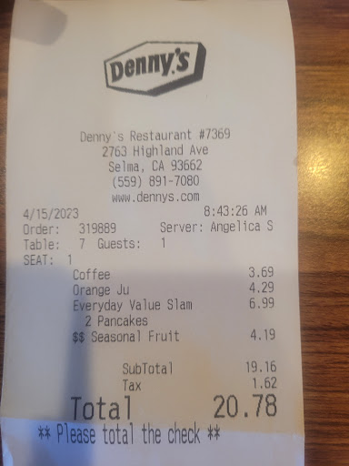 Read moreGM first of all , I hate to give Dennys in Selma,ca a bad review .We get there front service guy puts us on a table says a server will be shortly with you.Out of 2-3 female servers non of them asks us what we will be having to drink.They pass us but don’t asks us at all one is having a conversation with people in back of us the other one just passes by.Finally after 10-15 minutes a server decides to stop and ask us what will you guys be drinking we say coffee and says are you guys ready to order all fast.We didn’t have choice to look at the menu so we order.After a while she passes by our table with our coffee cups on a tray stops by our table instead of giving us our cups and serve us coffee she goes to another table and offers them refills she serves their coffee refill and comes back to our table puts the cups on our table and serves us the coffee.after a while they bring our food then we are eating and bring us our check out ticket to pay .So I was telling my wife we are not from here from Selma of course they going to treat us different we just passing by we usually pass by here once every 2 months.For sure we are not stopping by this Dennys anymore.We pay just like everyone else so I believe that fair and equal treatment should be for everyone.if upper management checks video if you guys have it you guys can see...