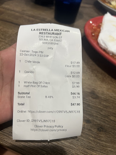Ā Ā Ā Read moreAs a regular, Iāll say this in the most respectful manner because it can happen to anyone. However, I had the worst experience Today, October 22, 2024, around 3-3:30pm. Me and husband went out to eat to this restaurant. Quickly we got greated, seated and helped which I loved! The service is always speedy and efficient. Today I ordered a plate which were the 2 enchiladas plate, combination. When our plates arrived our waitress (woman - late 30ās or early 40ās probably , black hair ,about 5ā1) i believe her name is Sara or Paty ( what it said on the tickets she gave us) .Super friendly. 10-15 min in (we ate about 70% of the food) eating, because I was getting full I realized we were eating CHEESE enchiladas and no wonder I was chocking on the cheese it was too much since they put a thick layer on top. I called over my waitress, telling her weāre so hungry almost done we realized they were cheese when we had ordered chicken enchiladas. She giggles and nodded admitting her mistake. She told us she would make chicken enchiladas for us and would be right out. When they got here she gave us the wrong ticket! Charging us nearly $50 . I didnāt say anything until we got up to pay. (She was real quiet now) pretty sure she caught on to her mistake . But I asked to pay for one plate for the mistake she made. She tried to argue with me saying she fixed her mistake that she was giving us the enchiladas already, I said i didnāt want to since we didnāt finish our plate. She agreed to only charge us one plate. But already then she was arguing with us and had an attitude. We payed and she told us to have a good day, i said you as well. It happens to the best of us. Will not come back again. And I do not recommend Selma...