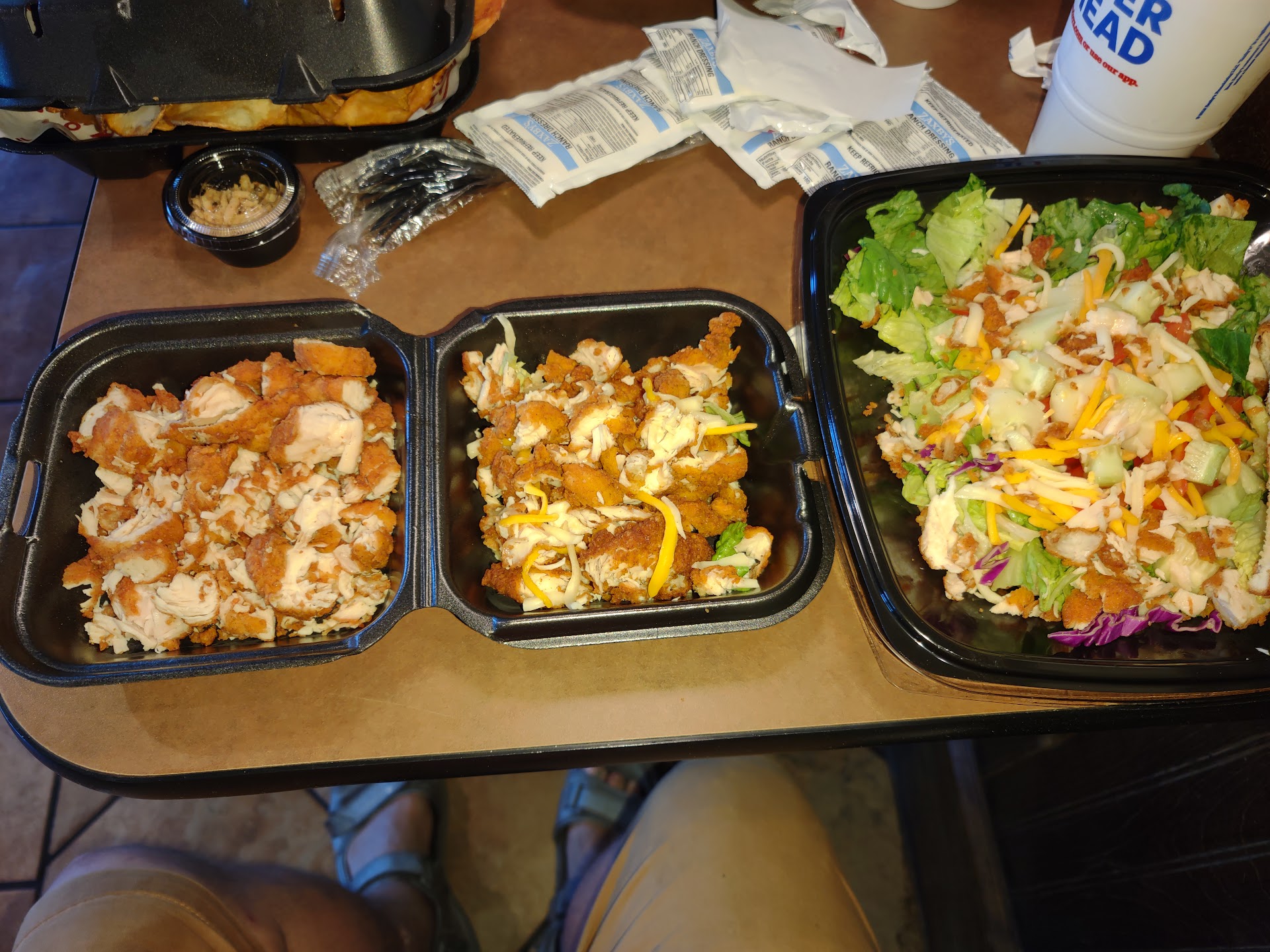 Read moreDouble check, triple check your order. I order a house salad. I asked how much chicken was on the salad. Answer from cashier 1 finger. I asked here to check and the answer was 4. So I order double chicken. Check my math 4x2= 8. Right. While waiting for my order I observed the counter girl looking at my salad as if something was wrong. She questioned the cook and continued on. When I got my order and opens it it did not look like double "8" chicken fingers. So I went to the counter and asked. I was assured it was 8. So I order 4 more chopped and returned to my table. I picked out the chicken from my salad. To do a comparison.. looks like four and four to me.. so they clearly lied!!! ...