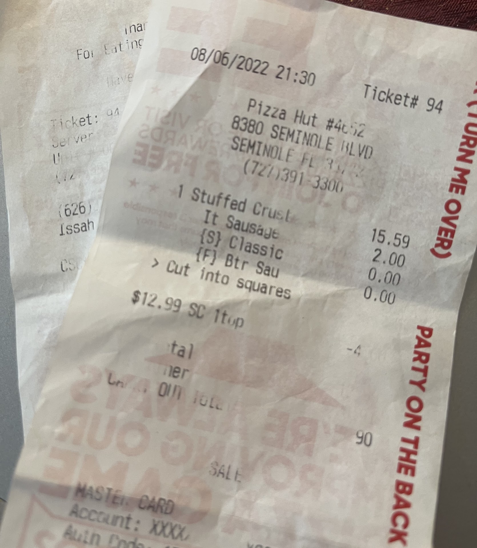 Had called Pinellas who is closer and they refused to deliver. Called here which is further and told them what happened they apologized for that store and said they would deliver. Therefore for now on if it's Pizza Hut it will be Seminole!! Our pizza delivery guy was friendly. The pizza was hot. The only thing I noticed is on the large pan you get allot of Pepperoni's even though they now charge a dollar extra for the pan which is ridiculous. Maybe that is why they do the pizza right with ingredients. The medium is skimpy on the pepperonis which saddened me as I love my pepperoni pizza. The brownies to chocolate for me and I love chocolate. The cookies were good. Wish they'd bring back the garlic bread with mozzarella cheese on it, but guess that's a lost cause. Wish they'd bring back the cheese sauce for the pizza crust also or the bread sticks as can't eat marinara as I'm eating it on my pizza and with MS you have to watch your tomato input. Don't care for plain marinara sauce for dipping anyway. It's like eating tomatoes yuck. Anyway pepperoni large pizza and chocolate chip cookies are greeeeat lol Really appreciated the guy taking our order and told him for now on we will go there and he thanked me. Pinellas word to you is...you...