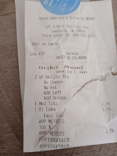 ย ย ย Read moreI'm so disappointed with this place. Today I ordered food for work. I get back in the receipt says exactly what I ordered. What I got was not the same thing at all. I didn't want cheese of course there's cheese I didn't want ketchup of course there's ketchup. I also wanted to add lettuce and onions.. do you think they're saying lettuce and onions no there's not. And that cheese is so disgusting! You can't even peel it all off. And it took forever to get my order. I placed it online and was even a few minutes later than what it said. Of course it wasn't ready but when I pulled up it said someone had my order and they were on the way out. But were they? No, they just clicked it in to make it look like they were delivering them fast. I sat there another five or six minutes waiting. I used to love Sonic but I'm kind of...