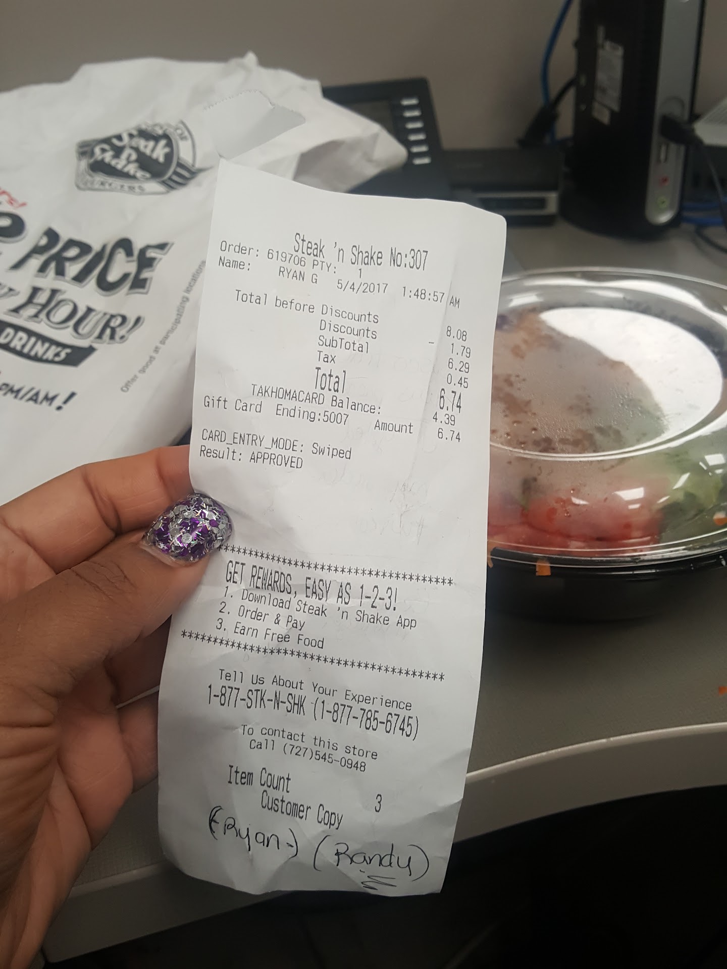 Read more2 Dead flies in my salad....A Weirdo working in the drive thru beware........Ryan or Randy....."0" stars...I work overnights so I come to this location because they have fresh salads,but tonight there was a Sysco food delivery truck by the drive thru running....I placed my order twice but the weirdo staff apparently couldn't hear my order due to the semi-truck idling so I pulled around to the window and proceed to give this jerk my order with a coupon. HE shuts the window as I was ordering and returns with an attitude and states, "That will be six hundred dollars and seventy four cents". SO I thought he was joking and I asked him to repeat the total, he said the same thing....So I waited until he gave me the appropriate total and then he says, "What! You can't decipher numbers?"....I said, "It's almost 2 in the am.....It's just need my salad please and the correct total." He snatches the card from my hand. I ask for the managers name..He said, "There are No managers." He returns 5 minutes later with my card and he continues to peek around the corner numerous of times....so I took a picture of his weird behavior. He return with my salad, no dressing nor utensils...I blow the horn...He ignores me...I took another picture of how close he was to the drive thru window...I get back to my job, open up my salad only to find 2 dead flies on top...I believe this Weirdo placed the dead flies in my...