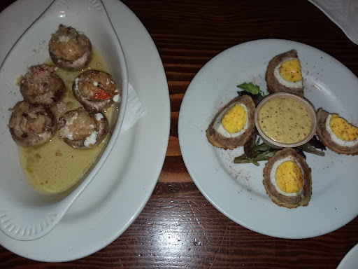 This was our second time going to McGuire's. The first time was an extremely busy Friday night (pre covid, this time last year). Even so, the service was prompt & the food was absolutely delish! I ordered the Bourbon Bacon Chicken, on that visit, with roasted brussel sprouts & mashed potatoes. Heaven in my mouth, y'all! We came for lunch today. We were seated fairly quickly. When our hostess put our menus down, the one she placed on top (drink menu) was visibly really dirty. She placed our silverware wrapped in a cloth napkin on top of that dirty menu. Kind of ick, but no big deal. We simply pushed those napkins away from our plates & used paper napkins instead. We ordered appetizers. Lobster stuffed mushrooms as well as one scotch egg. The mushrooms were SO good! Just keep in mind that they're pretty expensive ($12 if memory serves me well) and there are only 5 small mushrooms. The scotch egg wasn't bad, at all. We'd never had one before so really had no expectations. We each agreed that we'd probably never order one again as there wasn't much flavor goin on there, but it was a neat new food experience anyway. The honey mustard dipping sauce was tasty. One of our appetizer plates came out pretty dirty. Our waitress apologized and quickly replaced it for a clean one. For a meal, I ordered the fish & chips. The fish was cooked phenomenally and the homemade tartar sauce was spot on! The fries were just fries but not at all bad. And that bottomless slaw was super yum-o!!! Overall, a really good dish. My hubs got the Bourbon Bacon Chicken with brocolli & mash, this time. The chicken came out with very, very little sauce (which is liquid gold, ya'll, and an absolute must) but our waitress brought him out a small bowl (we later discovered that the bowl of liquid deliciousness cost an extra dollar but he said it was worth it, so it's all good) and so he left with a full belly and a smile on his face. Our waitress (I THINK her name was Julie or Julia) was extremely attentive & cheerful. Atmosphere is so fun. If it weren't for covid, we'd be regulars...