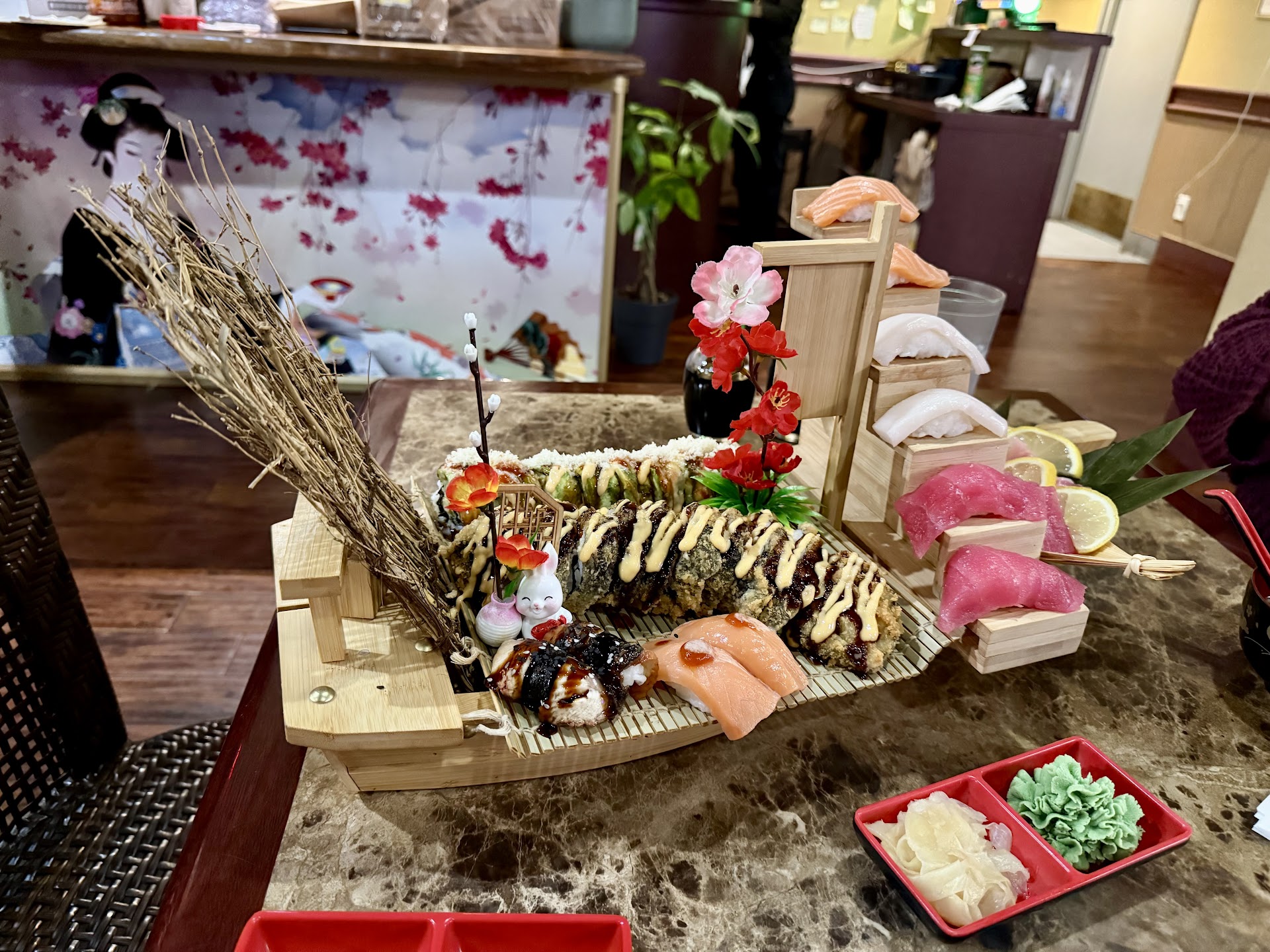 We never got our onion soups we ordered, but the sushi rolls came out pretty quickly, so that's a plus. By this point we were quite hungry so ate our sushi, but only 1 out of 4 rolls would be something we would order again (if you do come here, get the spider roll! It is really good).