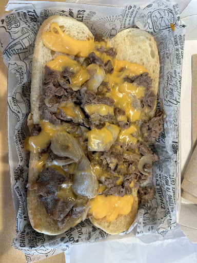 My go to food is the old school cheesesteak which is a Philly cheesesteak topped with melted cheese whiz and grilled onions. The buns are toasted and holds up very well. A delicious meal! I make it a combo with regular fries and soft drink. If you eat in, know that they have ketchup, malt vinegar and a dry seasoning for the fries. Drink refills are free. I get the medium size cheesesteak and itâs a lot of food and worth it.