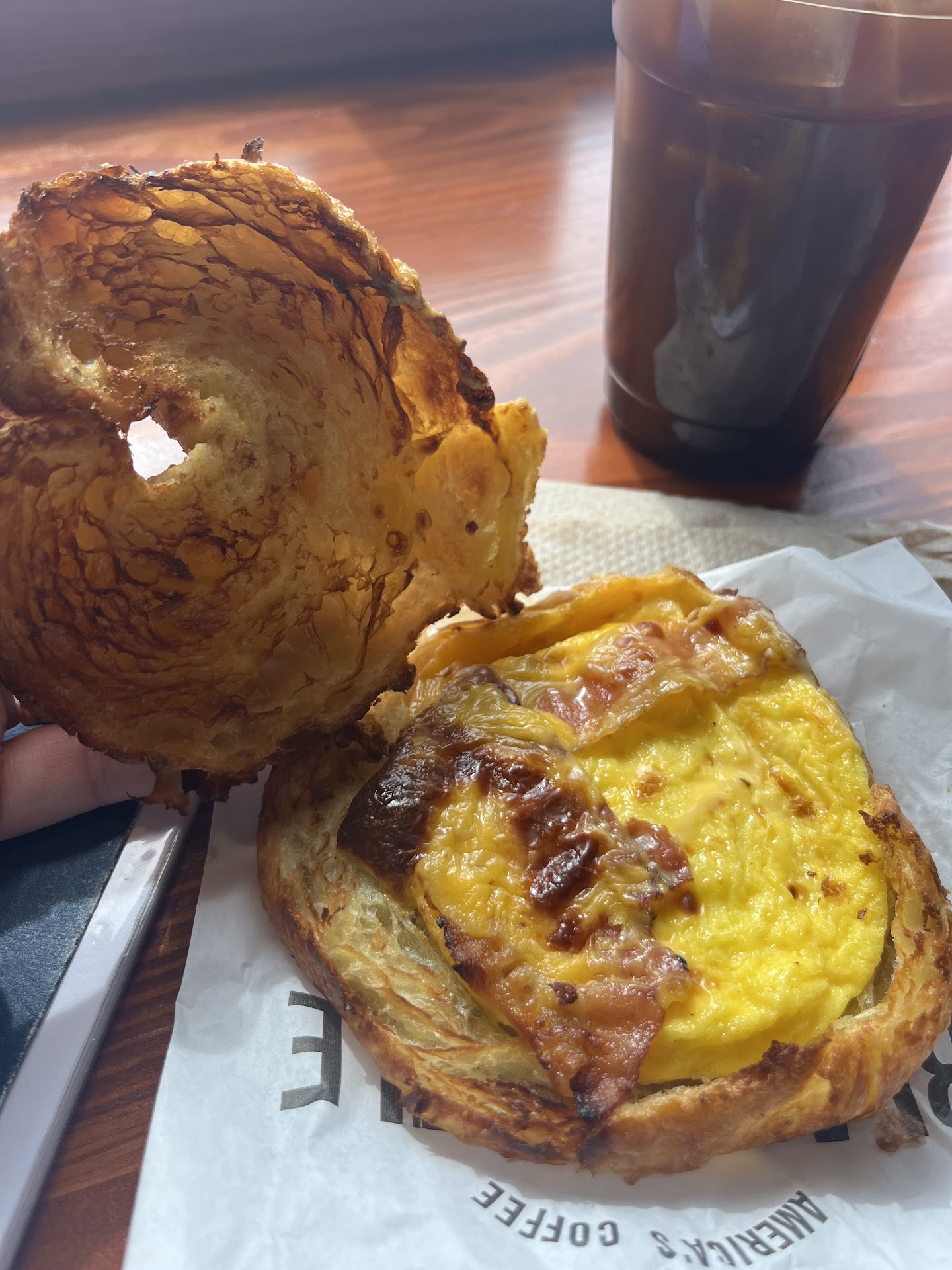 Read moreNot a good experience today. My first visit to BRCC and I probably wonât return. When I walked in there was about seven people in line so seeing that you could scan a QR code and get the app and skip the line I did so. I believe this was my first mistake. Put in a mobile order it was supposed to be ready in 10 min. I chose a seat and waited. At 9 min I went to the counter and let them know my mobile order number. She responded with, âgreat we will get them at STARTED for you.â What? How was that âskipping the lineâ?? 10 min later than called my name with my order; only it wasnât what I ordered. I pointed out the mistake and they graciously remade my drink. I finally sit down and take my bacon/egg/cheese croissant out of the paper. As you can see in the picture âbaconâ is more of a thought than an actual taste. Iâm also pretty sure that they still didnât make my drink correct because it is so sweet I literally canât drink it. If I return, Iâll stick to black coffee...