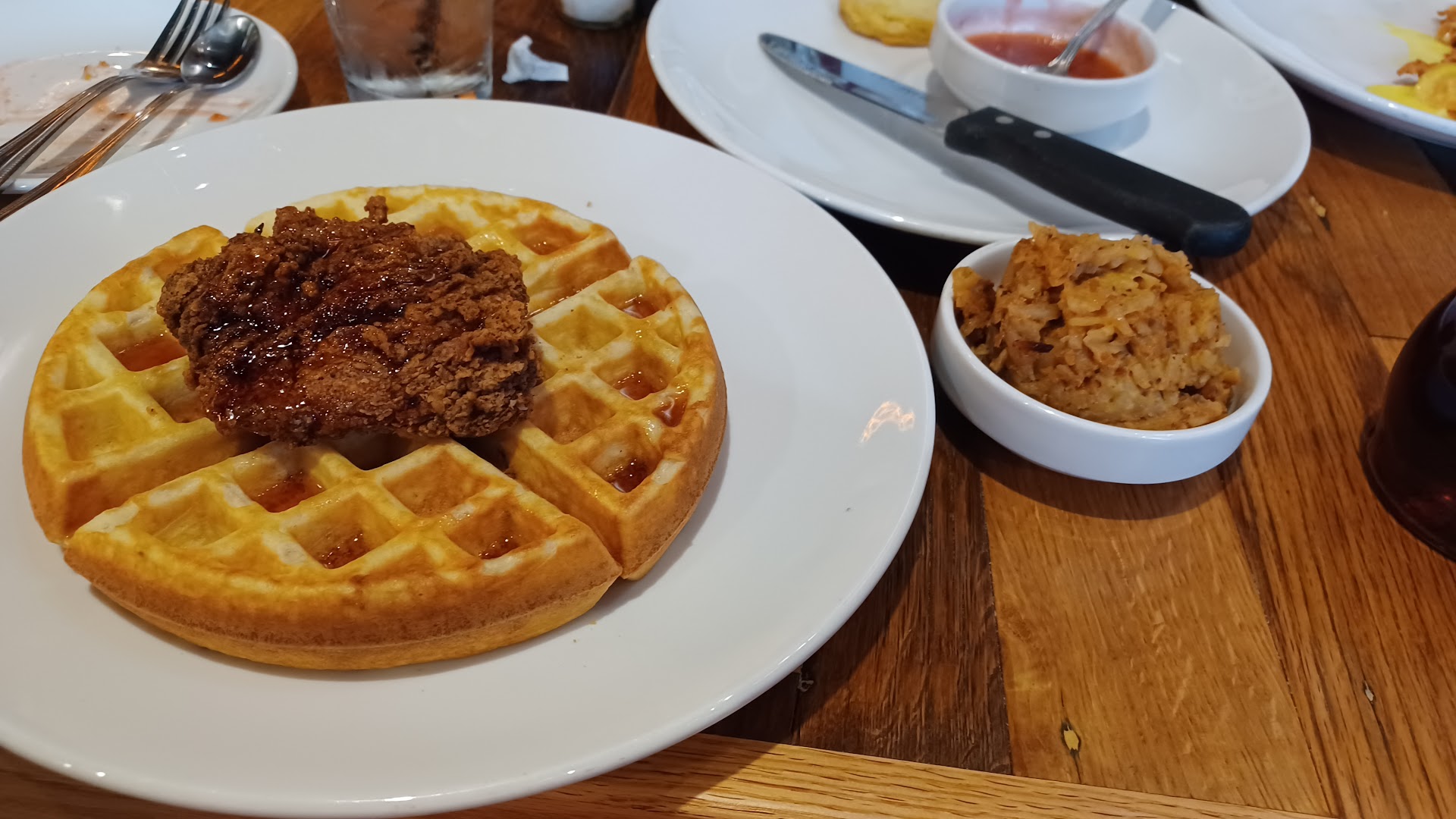 Read moreToday was our first visit here. Our server James was outstanding. Very polite and friendly. Took great care of us. We started with goat cheese and peach biscuit appetizer. Very delicious, soft biscuits. Loved the strawberry jalapeno sauce. My chicken and waffle was pretty good. The chicken looked over cooked but it tasted good. I paid 3.99 for a helping of hash-brown casserole and it was not good at all. Neither of us thought so. It was really dark. I first thought it was dirty rice. It really didn't taste like potatoes and it hard to even tell if it was potatoes. It tasted really bad. We couldn't eat it. I notice in other reviews my hash-brown casserole did not look like others? Husband had the smoked salmon Benny. He thought was Very good. What I absolutely did not like were the bathrooms. 2 bathrooms that are both men/ ladies bathrooms. No woman wants to sit on a toilet a man has stood over and peed/dribbled all over it. While one bathroom was locked this morning, I turned the handle to the second and walked in, to find a man holding his private part swaying back and forth leaning over the toilet.. he had not locked the door. Parking was hard to get. Circled block 3 times before finding an open spot. Please make bathrooms 1 for men and 1 for...