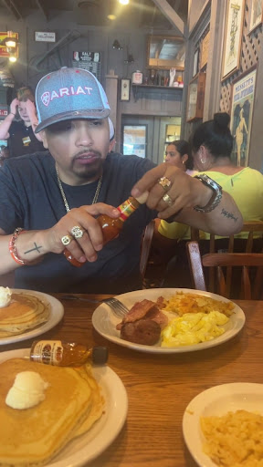 My Bestie had suggested we come here. She said, “Hey there’s a Cracker Barrel Close By, you wanna go?” Of course I’m down for some good Home Cookin’! We packed up our babies and headed out. When we pulled in, a lot of the spots were taken! It was quite busy for a Friday Night! There were a bunch of spots too! It surprised me how busy they were. Getting seated was a little bit of an issue. As they sat others down before us, even though we arrived before them. No biggie. We still ate. Anyways, another thing is there wasn’t a lot of Room… for example: my Friends Daughter had to sit pretty much in the aisle. And I had placed my son on the seat next to me. (He was in a car seat) there were two or three times during the course of our Visit that the person behind my Son, kept bumping into his seat. The tables and chairs weren’t really spaced out that much. There was even a time where I was holding the chair steady while the people behind me were moving and he ended up pinching my finger between the Two chairs… We had Holly for our Waitress! She was such a Sweetie! What a Fantastic Job and service offered to us! She was very sweet and jumped at the opportunity for conversation. Very Personable with a great Personality! She quickly asked us for our drinks and brought them back, giving us time to look over the menu. I did not feel rushed ordering and she was very patient. I attempted to Order the Sirloin Steak Tips, but it was after 6pm, so I couldn’t. Instead as my Backup choice, I had decided on the Cream Cheese Stuffed pancakes with Two Over easy Eggs and a Side of Bacon! Delicious!!
