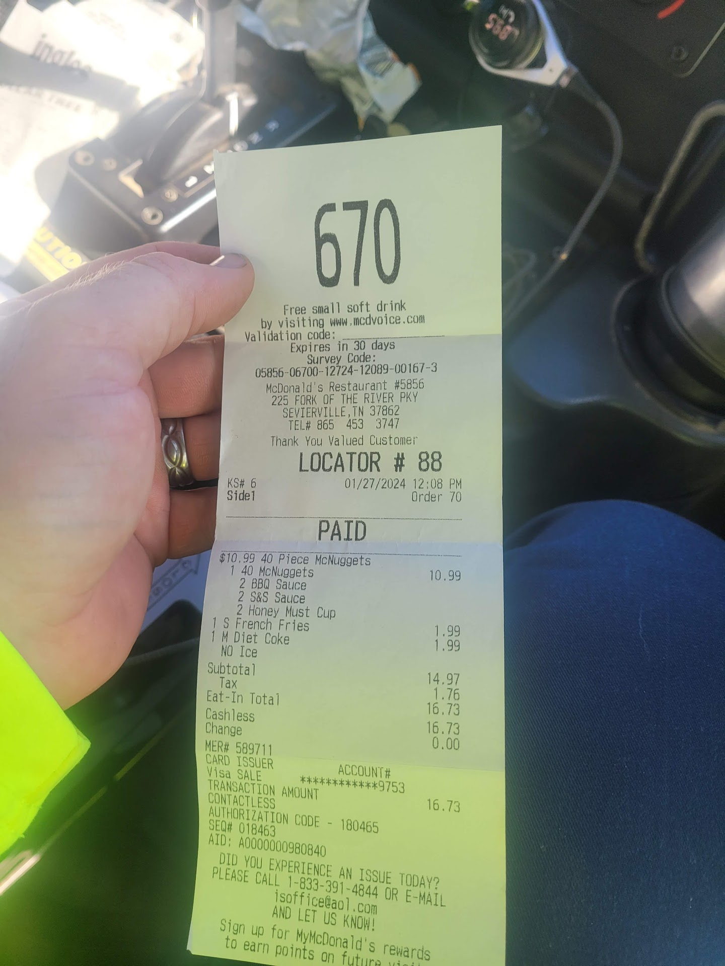 Read moreDidn't recieve my drinks in drive thru, went back around was told have to wait in line again and to go to middle window.asked if I could go around to dt window 2 and wilda ? Wes rude told me no that only for uber ? Then as im passing her window she slams receipt in my hand and shakes her head...and yes the drinks are on the ticket...this was so uncalled for and ridiculous ...we are locals here and drive past the one by our place to eat at the nicer location...so we get up to middle window no drinks made yet a mgr asks me what's wrong told her they just forgot my drinks thought she was gonna fix but no...then this young strawberry blonde mgr or shift leader comes up asks what's wrong and fixes my 2 drinks .....kudos to her on stepping in and handling issue..i thanked her and left ...unfortunately by this time our food is trash and cold ...sad...im a retired mc d mgr so I get it accidents happen but this was just sooo unprofessional... Ks#13 order 55 (ordered on app) which I love by the way and seq#...