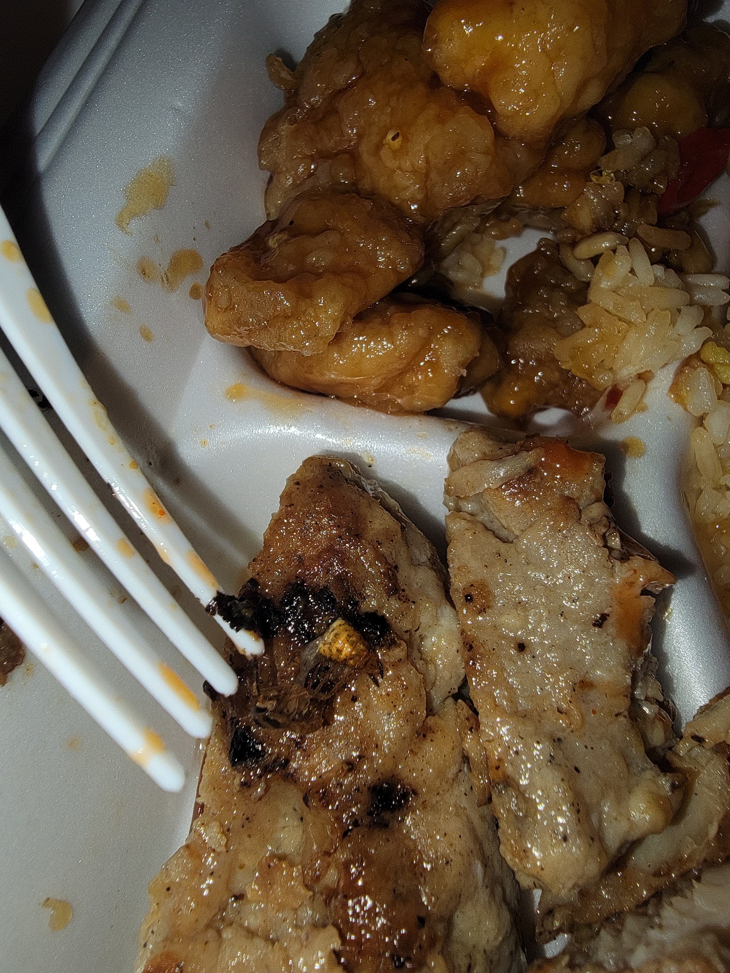 We couldn't quite understand her first address to us, but she basically ignored our pleasantries and just said "What do you want?". I started to order a bowl with white rice, which she began to fill. When she had turned to ask my entree item, I tried politely asking for a sample of the new Blazing Bourbon Chicken because it's a new item on the menu, and she just simply shook her head and said "No". I asked her for clarification, "You guys don't do samples?", and her response again was just "No" and shaking her head. At that point, we felt it was a pretty rude interaction with a customer just asking for some customer service after being basically ignored when we came in, but it got worse as I started to look down the serving line for an alternative entree option, and she then decided to make a snide remark in Spanish to her younger male co-worker standing near her.