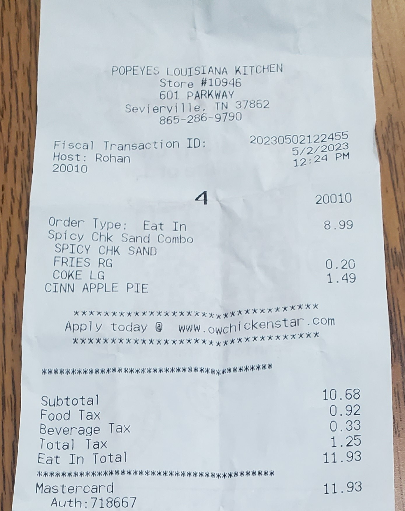 Read moreTonight we went to the Sevierville Popeyes to get dinner. We have worked a long day and decided to go through the drive thru. We waited for approximately 22 minutes to place our order since there were a few other cars ahead of us. When we finally got to the speaker to order, the guy told us that they just took the last order for the night!! Needless to say we were disappointed to say the least. THE FOLLOWING IS WHERE YOU HAVE LOST OR BUSINESS GOING FORWARD... I called to speak to the manager. I told him what just happened and that we didn’t appreciate waiting for 22 minutes just to be told they couldn’t take our order. I asked for the Managers name and he wouldn’t give it to me. He actually asked me who was asking. Umm duh, it’s the customer complaining to you sir.. I have been a General Manager for over 10 years. If a customer ask for you name, you don’t question them. You just give them you name. Aside from that the manger said that they already tagged the last car and couldn’t take our order. Well why the heck couldn’t you send one of you team members out to tell us and the other 4 cars behind us that you were no longer taking order? It’s not like your drive thru is a fast one. NOPE, instead we wasted 22 minutes. I would like to point out that I visit this location at least 3 times a week and I buy all my employees food for lunch there once every week. NOT NO MORE, with a manger like that running this place. Again he didn’t give me his name, but it was on 5/29/2020 @ 9:12pm and google says your open till 10pm. Get it...