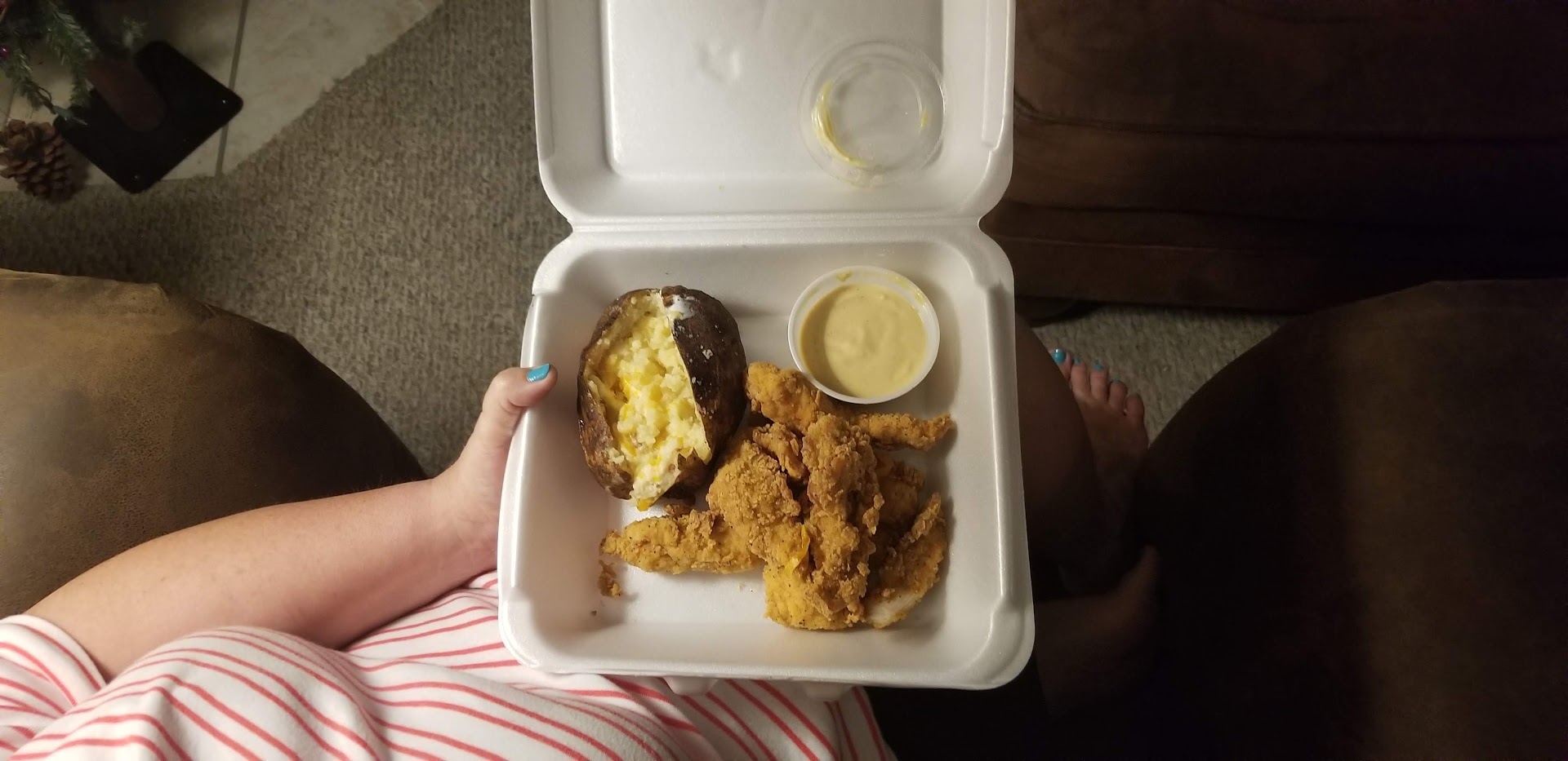 The take-out food food we got was absolutely disgusting as we learned when we got home. The potatoes fries were old and stale, the BBQ chicken nuggets were also chewy and old - gross! The Potatoes Skins were equally bad - stale and old, and the bacon chips were so old and dry they were crunchy and hard.... the (ONLY) thing that was good were the buns and the cinnamon butter that was given for the buns.... the food had been sitting around and was not fresh, and tossed into a bag with containers and given to us since we did not eat-in.