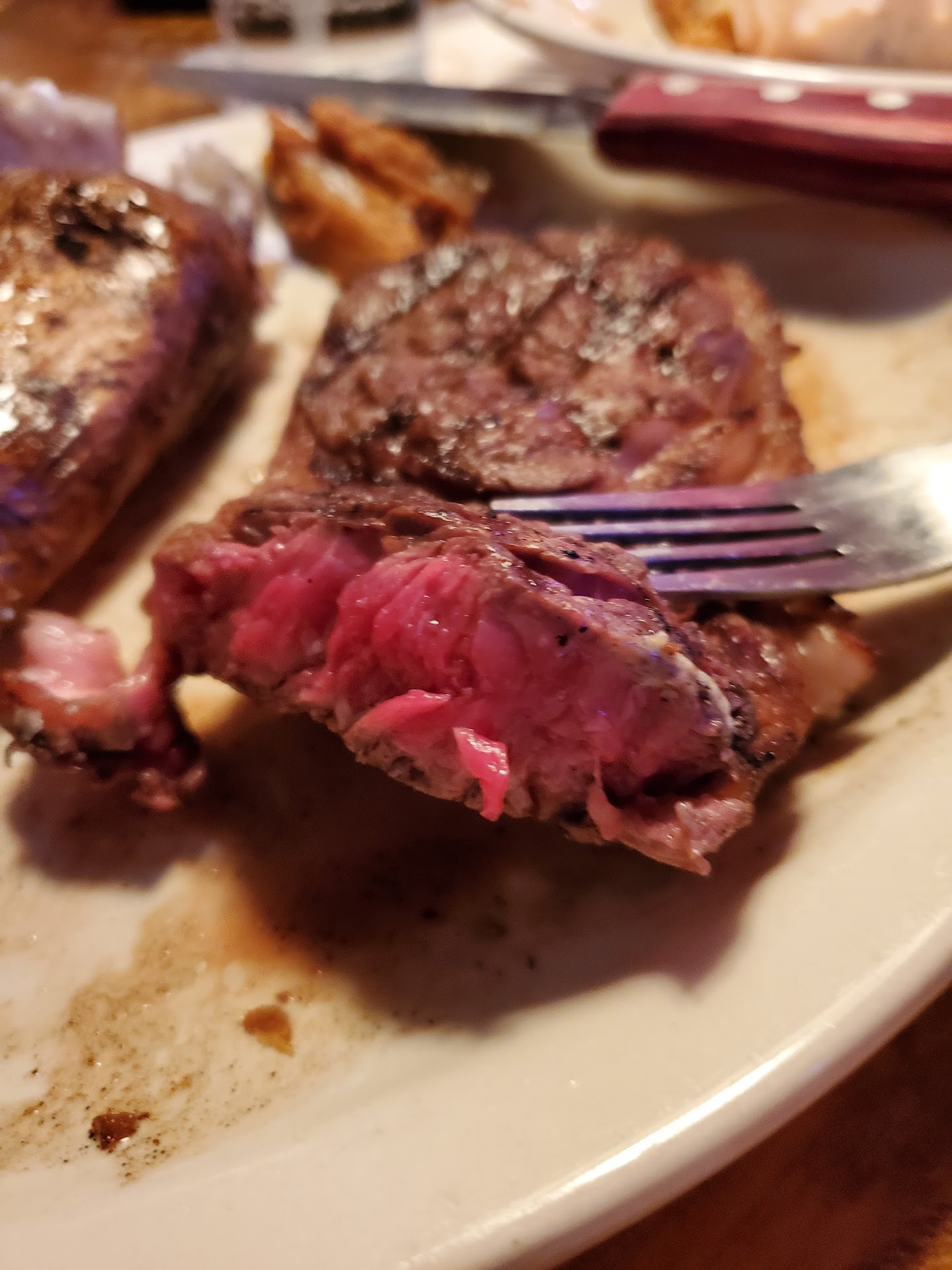 Third (I do not blame this on my server), my first steak was well done instead of medium. The second one came, but it did not have the onions or mushrooms that I ordered. I believe a manager brought this out. Temp wise, this was perfect, but left those toppers off. I was still charged for the toppers but was afraid of asking for them since it seemed that they were too busy to accommodate us. I still appreciate that they replaced my first steak.