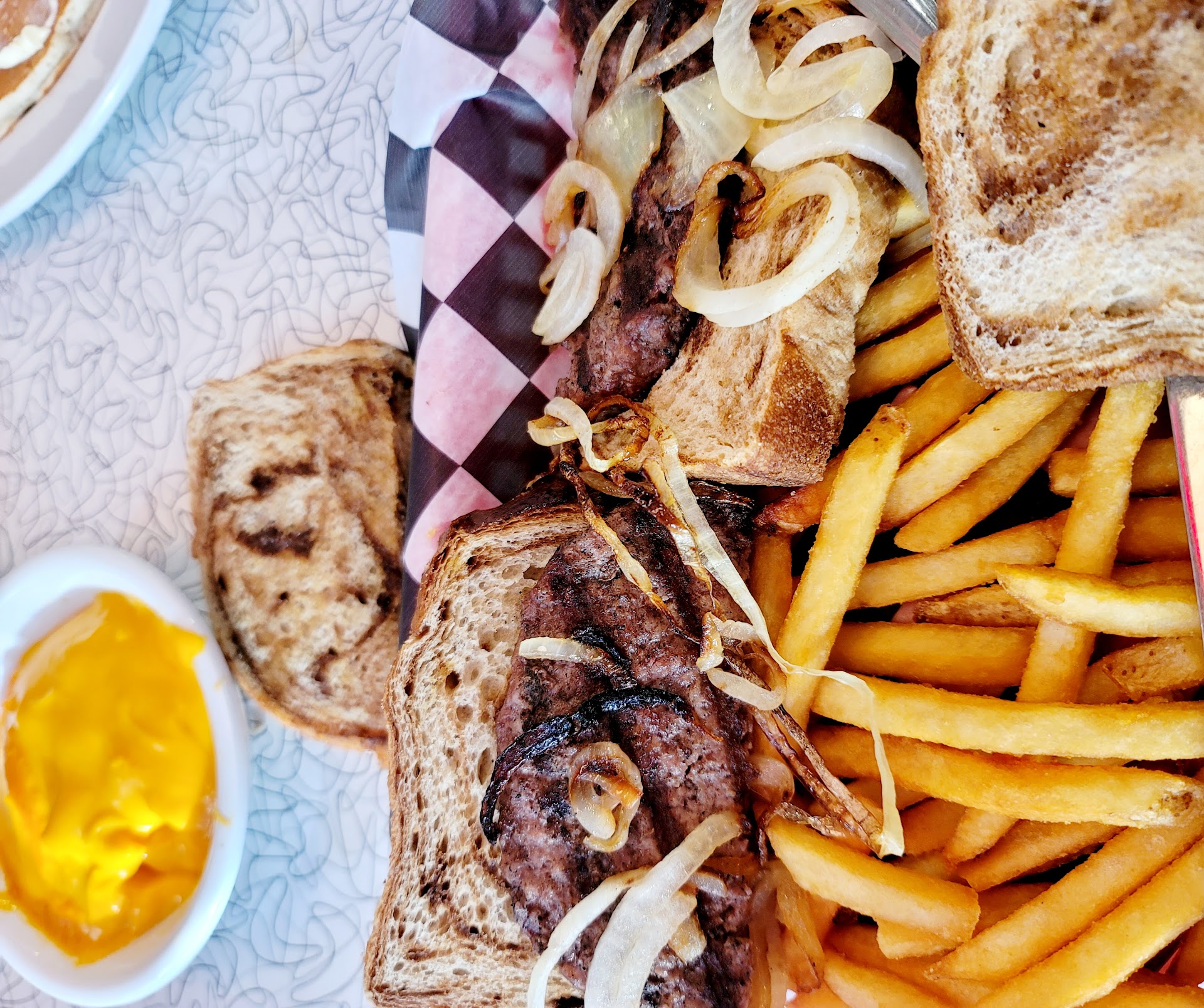 I was delighted the whole menu was open all day. So I ordered a Patty Melt, tickled that I could get one for breakfast, along with fries with cheese on the side.