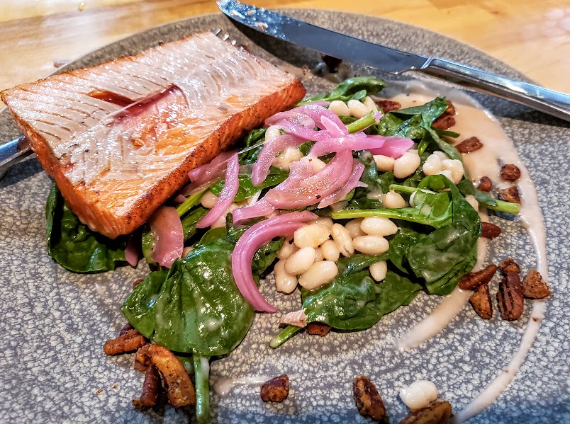 Unfortunately everything tasted thin/watery to me. The halibut had a wonderfully seasoned crust but the fish itself was so most moist (and thick) that the flavor quickly disappeared. It may have needed a bit more time in the pan. The sauces were good but, again, after the initial taste the flavors kind of disappeared. The water in the rice and the fish needs a bit more punch behind it. I could have had an insensitive tongue day but the mushroom toast was so good I don't think that was it.