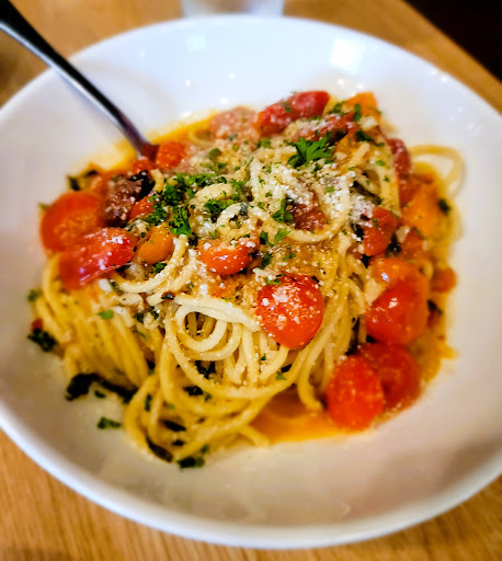For my entrĂŠe, I stuck with the olive oil theme and ordered their Spaghetti allo Scarpariello, which was excellent! The cherry tomatoes add a very nice sweetness to the olive oil and wine sauce. The pasta, freshly made in-house really does an excellent job absorbing much of the flavor and itâs texture is spot on, al dente. The garlic in this dish was perfectly portioned, as to not be over-powering, but be present and flavorful!