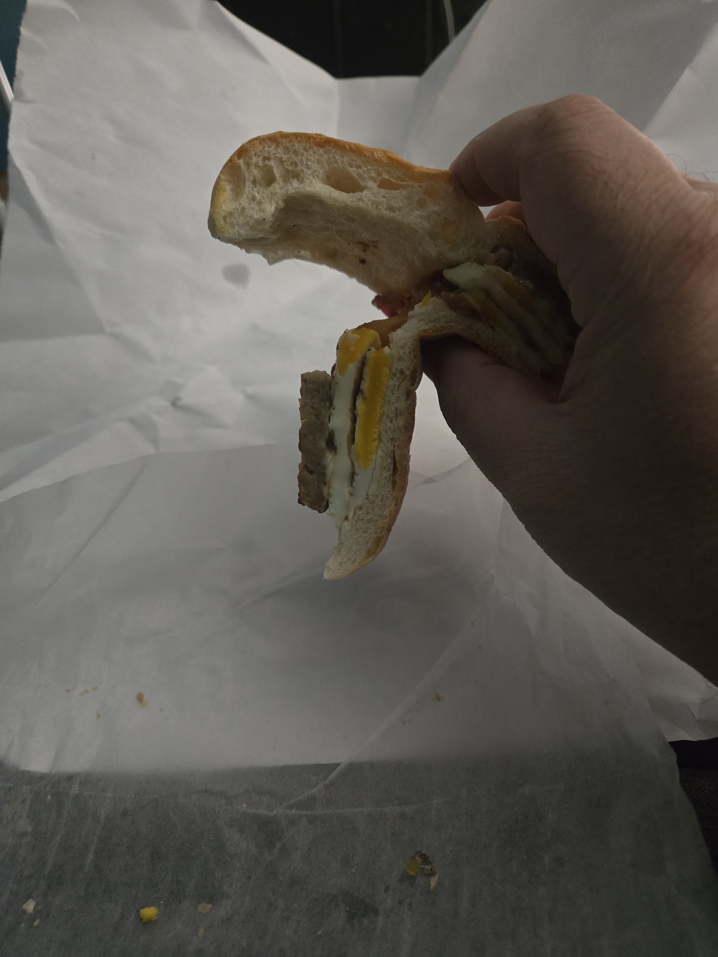 First, just something that was annoying. I kept getting small pieces of food falling on my lap. First it was egg, then sausage. Finally, I dissected the sandwich to find that my eggs and meat were cut into quarters and placed on my sandwich. Although by the photos, you can see how well they balance the sandwich out with these quarters of meat, egg, and hopefully cheese. Also making it easy to drop pieces of food all over my lap.