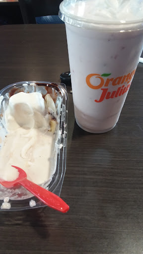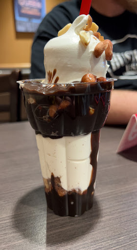 Ordered 2 choc milk shakes 1 med Fri and a chili dog. Waiting in drive thru got to window was told to pull over they would "run" it out. Waited 8 min ( more like a slow crawl) received Luke warm chili on a ice cold hot dog. My guess is the chili was Luke warm because it had to thaw the frozen hot dog. There was maybe a dozen fries in the medium Fri and the milk shakes had to be eaten with a spoon (another words ice cream) After waiting 8 minutes for a frozen chili dog I wonder 1) how they can be considered "fast" food and 2) Given that the food was uneatable I think they should stop trying to sell anything other than Ice cream (as that is what they are known for). If they are unable to produce milk shakes and the grill obviously does not produce hot food, lord knows it wasn't even Luke warm food, perhaps they can sell ice cream. We did get a refund on the $4.00 cold dog. Outrageous. Our mistake...