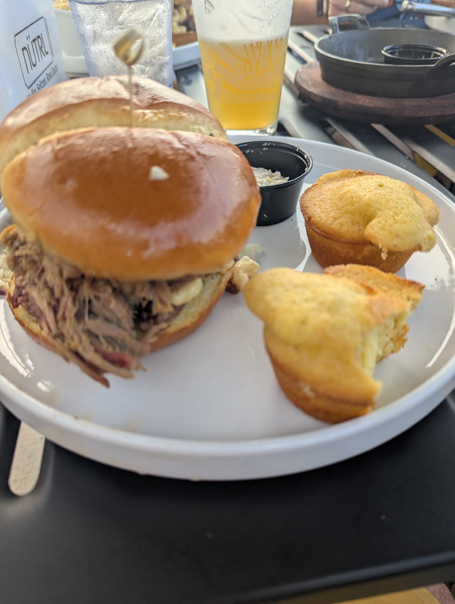 The sides were the better part of our meal. We tried the coleslaw, which was fresh and very good, the baked beans, which were also good, fresh cut fries, and we each got a cornbread muffin. Muffin was good but sweet. Personally, I like when a sweet muffin is served with a salted butter and a savory muffin is served with a sweet butter to balance the flavors. The sweet on sweet was just toooo sweet!