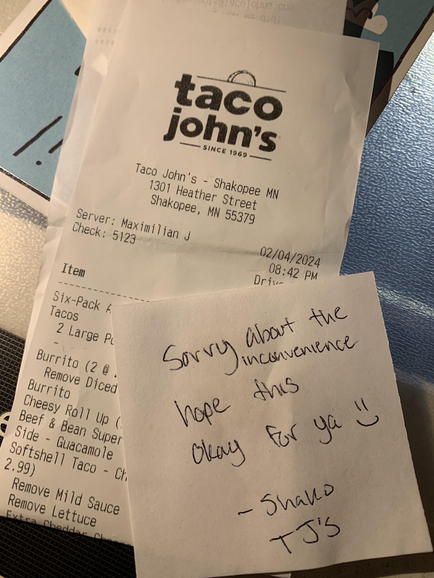 Read moreI ordered Uber Eats from this Taco Johns, spent $30 with tip and delivery, 50 minutes later I received the wrong order with no receipt or name attached to my items. Not even a single item was in it that I ordered. I then request a replacement/refund, I then order AGAIN my same order from this same location. I am then 40 minutes later given my order but missing a few items, and wrong sizes, and of course it was only MY side of the order that was missing, not my partners, so I had to suck it up. Was about to just drive there myself and ask for the needed items, but just didn’t wanna deal with this location anymore. 2 1/2+hours of my time, about $45 dollars in total and I got a drink and a cheese quesadilla….Will never ever ever come here again or trust anything to be ordered here....
