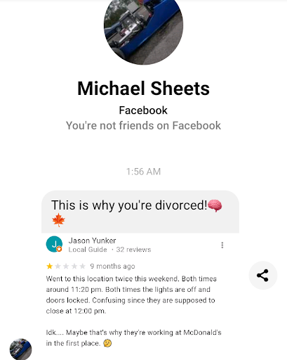 He refunded my money and and said, "Just Go! I want you to get out of my restaurant!" I told him I had been coming to this McDonald's for years and that was my dinner. Why would I make up a story? (Been going here for 12 years and nothing like this has ever happened.)