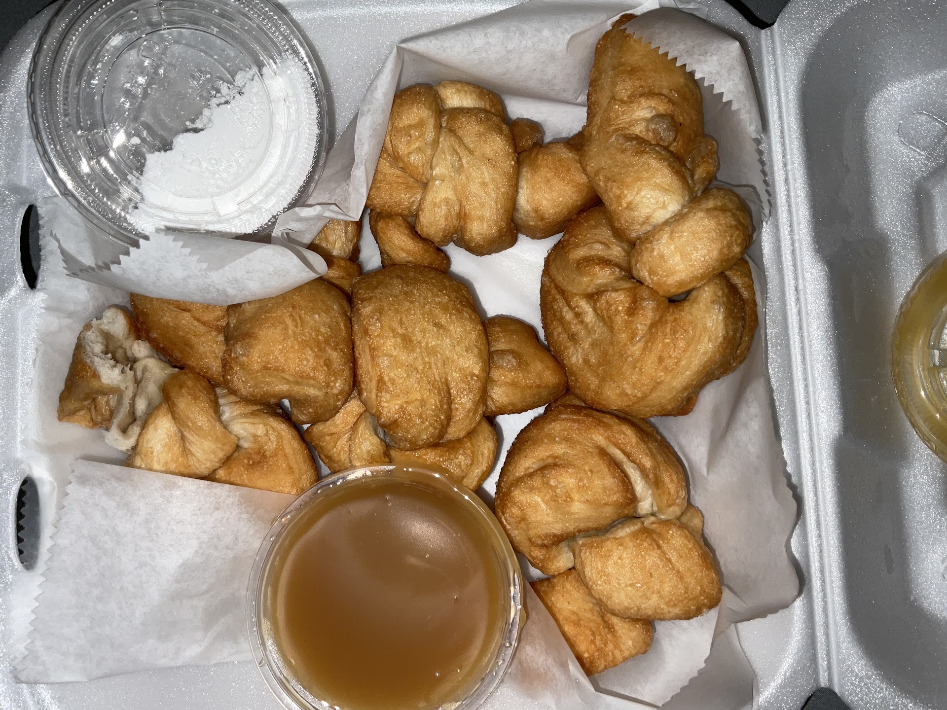 The funnel knots came in an adequate portion for a fairly reasonable price. The dough itself is homemade, although I doubt the caramel sauce is. Still, it was a pretty tasty way to end the meal. Inside is fluffy, a little crispy on the outside (would have liked more crispiness to the dough), and you get powdered sugar with choice of chocolate or caramel dipping sauce.