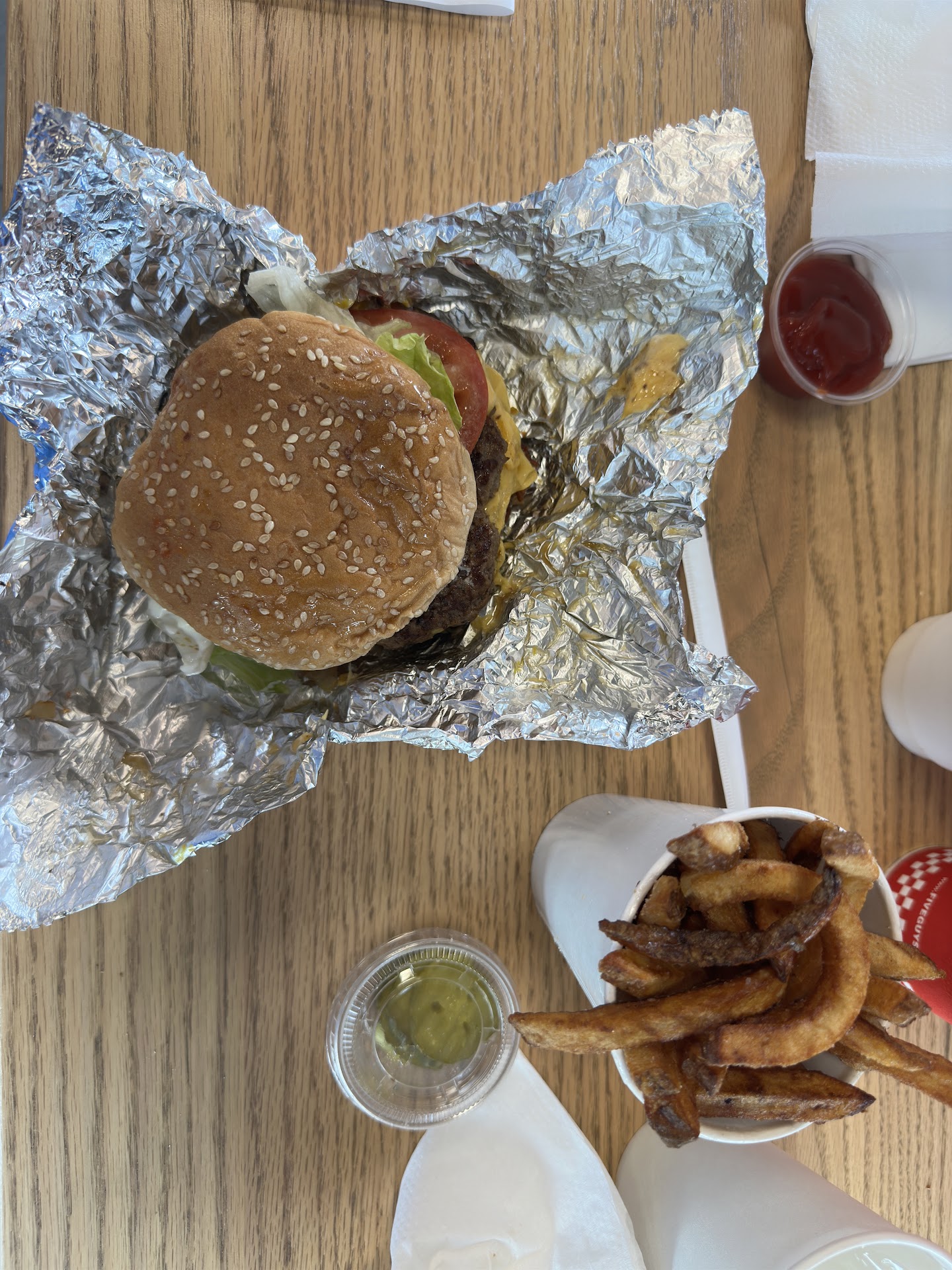 Ā Ā Ā Read moreI recently visited Five Guys with high expectations, but unfortunately, the overall dining experience left much to be desired. The first disappointment came with the food's taste; the burgers were greasy and lacked the flavorful punch I was hoping for. And my burger was slightly pink. The fries were equally underwhelming, as they were overly salty and lacked the crispy texture I associate with a good fry. Beyond the taste, the service was also lacking. The wait time was surprisingly long for fast-food, and the staff appeared disinterested and unengaging, failing to deliver the friendly service I had heard about from others. Additionally, the pricing left me feeling unsatisfied. While the menu boasts fresh ingredients, the cost seemed disproportionate to the quality of the food and service received. I had hoped for a more enjoyable experience given the higher prices. Lastly, the ambiance of the restaurant was loud and crowded, making it challenging to hold a conversation with my dining companions. Overall, my visit to Five Guys was underwhelming, and I am hesitant to return given the disappointing food, lackluster service, and the relatively high cost. I'll be exploring other dining options that offer better value and taste...