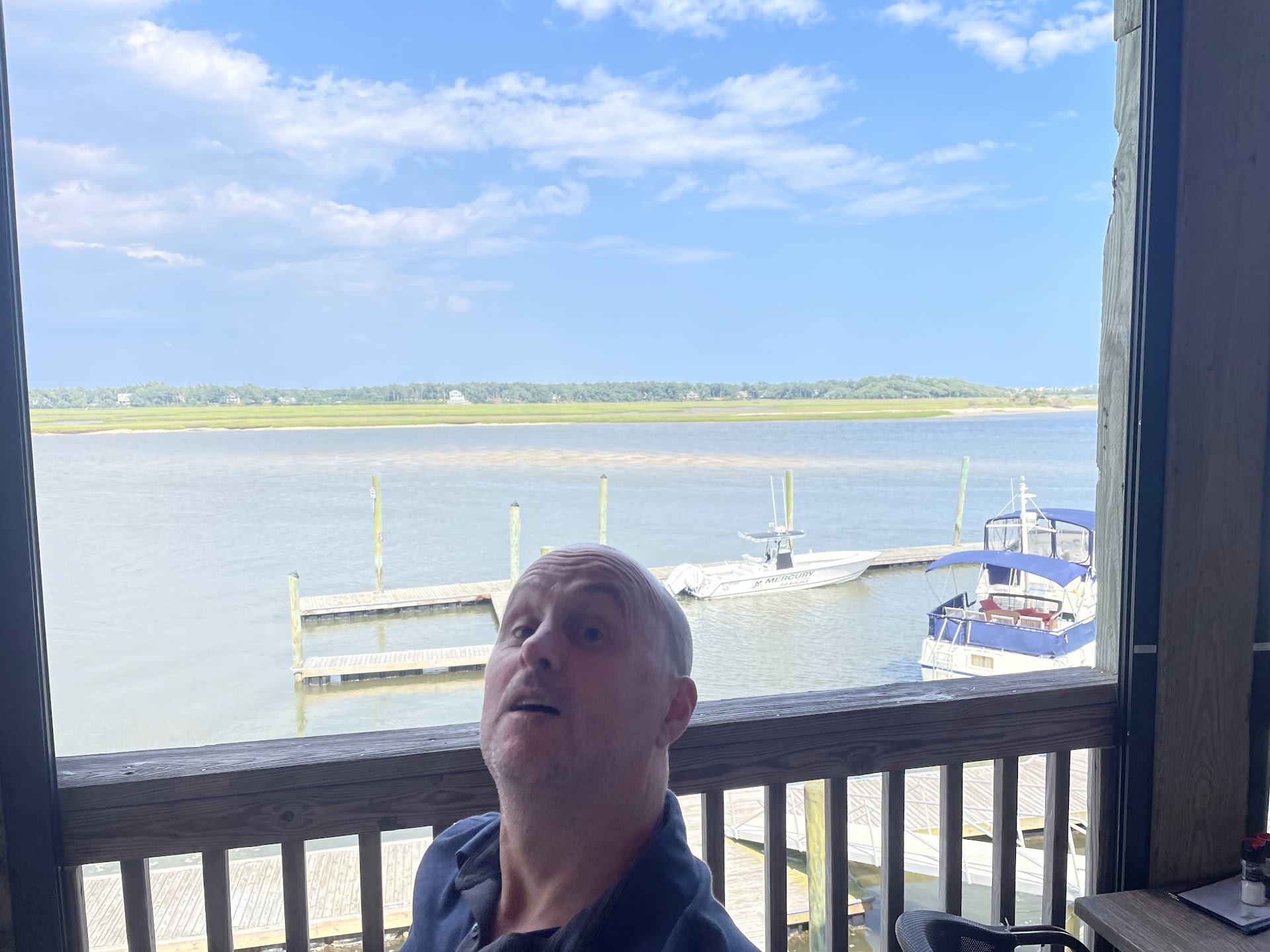 As usual if you have read any of my other not so great reviews you know I dislike writing these but it is what it is. I want all restaurants to do well. It is a very tough business so please remember that when reading my not so good reviews or when you have a bad experience. I went here because a few years back I saw it on a NC tv show called Flavor NC and because they are listed as a restaurant on the Brunswick Catch website. Brunswick Catch is an organization comprised of local commercial fisherman, seafood dealers and restaurants. They work together to try to save the local fisheries and to provide local fresh seafood. Google Brunswick Catch and try to support them if you can. I was in the area today and they were open so we gave them a try. The restaurant is pretty secluded from any other businesses. At one point I wondered if google was taking me to the right place. Lol. The restaurant is a rather large building and the view is very beautiful. I assume they are really busy in the summer time. They can accommodate a lot of people with a building and property that size. Anyhow on to the food and experience. When we walked in on the ground level floor which is basically outside we were not sure if we were suppose to go up stairs or what. A lady behind a counter called us over and took my name/phone number. She asked if we wanted to sit inside or out. I said we would be willing to sit at either just what ever is first available. She then told me they were not sitting anyone outside. It was a bit bizarre. Literally a few seconds after she entered my name and number in her computer I immediately (like in a couple seconds) got a text telling me my table was ready and she told us to go to another hostess up stairs. If they were really busy in the summer I would understand some of that but that was just bizarre to me. When we got to the hostess upstairs the lady asked me if outside on the deck was okay. Lol. To be fair there was plastic covering the openings to the outdoors but we sat on the deck. When our waitress came to our table she was very pleasant and took our drink order. She brought us hush puppies and butter. The hush puppies were small and I am not sure if they were cooked too long, the oil was not hot enough or too hot but they were very greasy and had a darker color. The butter was very good. We asked our waitress for suggestions and she said the claim strips, crab dip or bacon wrapped scallops. We both ordered the 3 item combo so we could try several options. One of the combos had fried white shrimp, deviled crab and fried flounder and the other had fried white shrimp, fried oysters and deviled crab. Both came with fries and Cole slaw. The Cole slaw came out in a plastic container similar but larger than what the cocktail / tarter sauce was in. The Cole slaw tasted very sweet and to me not fresh. The fried combos had a lot of food on the plate but stacked in a way that some items were covered which affected the shrimp for sure. The fries had a good flavor but again the fry was off. The shrimp had tails on and tasted very fresh but the batter was kinda soggy I think because some of them were covered under fries and the flounder. The flounder was awful. It tasted burnt and dry. It did not have much batter on it and it was cooked too long or in oil too hot. See my pic and you will see the part of flounder you can see in the pile of fried food it almost looks grayish and dark at the end. The deviled crab was very good. The oysters were just like the shrimp in that they tasted fresh but the fry was off or maybe they were covered to long by other food. No clue. Either way not crispy at all. Other than the slaw I think the food product is very good but the execution was poor. We did not complain. Our waitress only came back once and we were both tired from traveling and had more to go. I would maybe give this restaurant another try if I am in the area. Nobody is perfect all the time and they do have a lot of great reviews so we shall see.