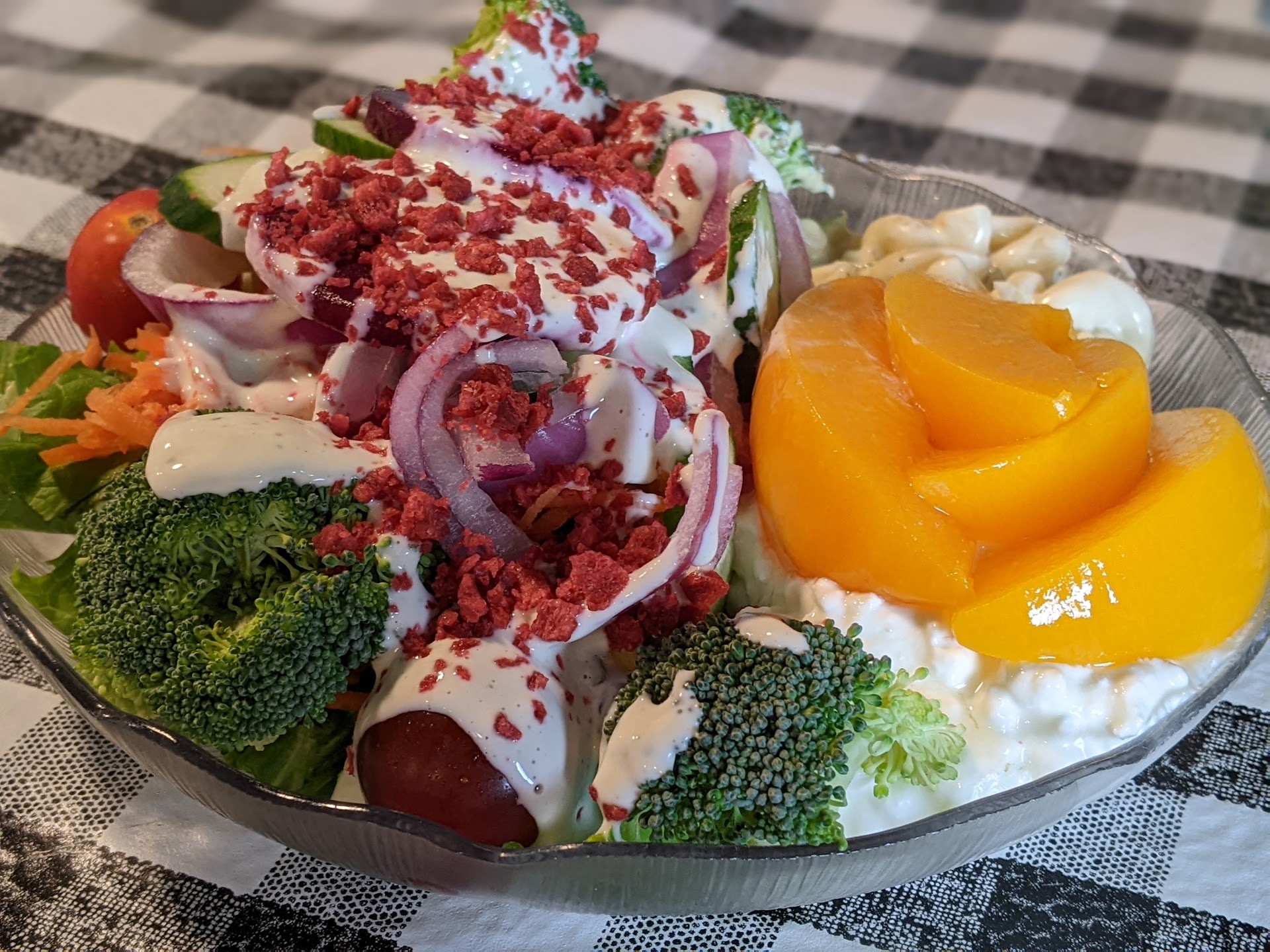 As promised, the black & white themed throwback restaurant has a menu featuring a variety of steaks, seafood, and the famous salad bar. I ordered the BBQ ribs (full rack), mom ordered a sirloin, and sister ordered shrimp scampi (I think?). We all got the salad bar, too. Salad bar was very good. Fresh, colorful, crisp veggies. Chilled fruit. Numerous toppings and dressings. It may have been the best part of the meal?! 🥗