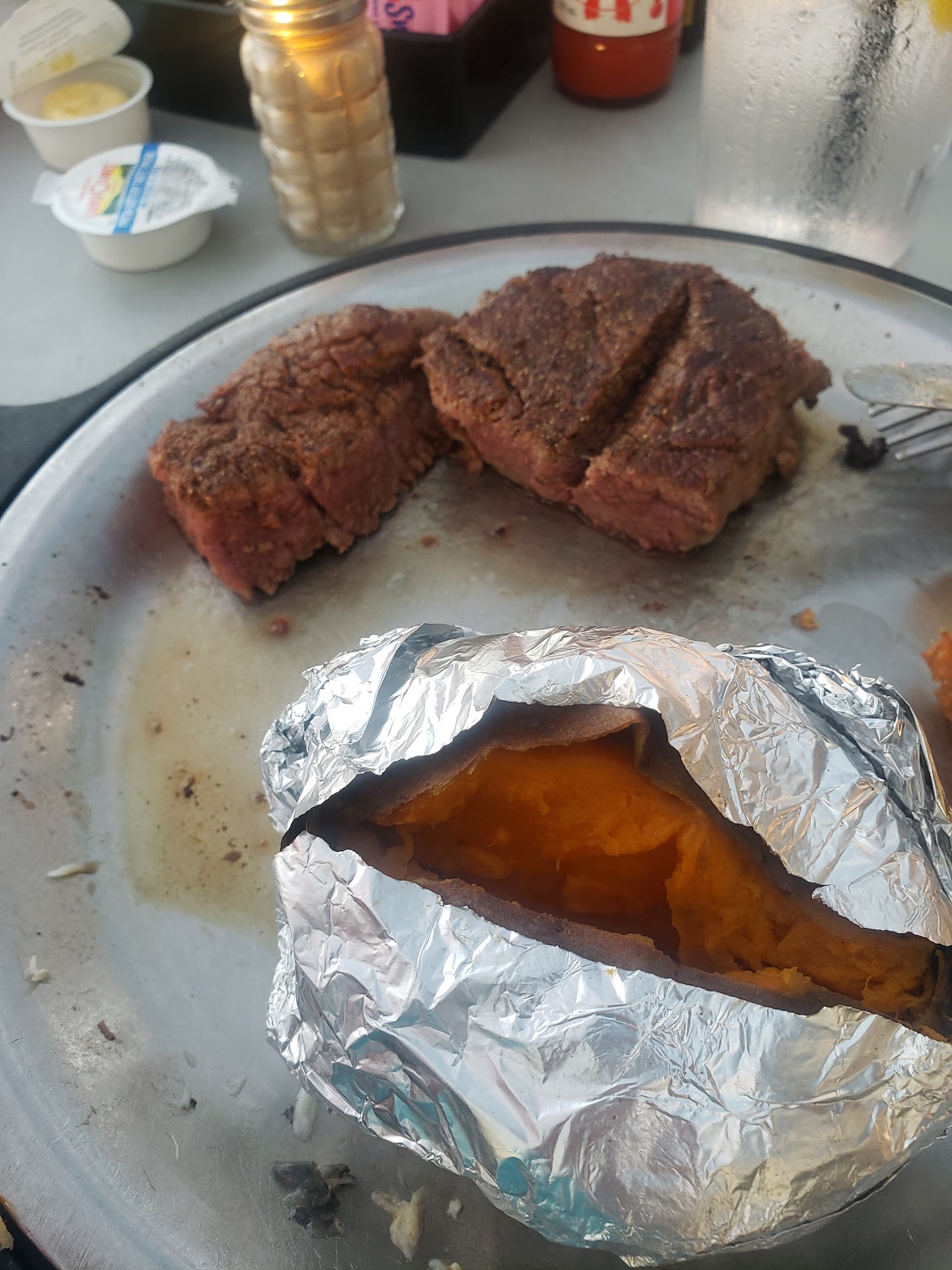 The ribs were a large, hearty portion, and they tasted pretty good. But, the meat was only warm, not hot. And, the ribs were very fatty. The sirloin steak 🥩 was also okay, but not great. Ditto for the 3rd entree (shrimp scampi?).